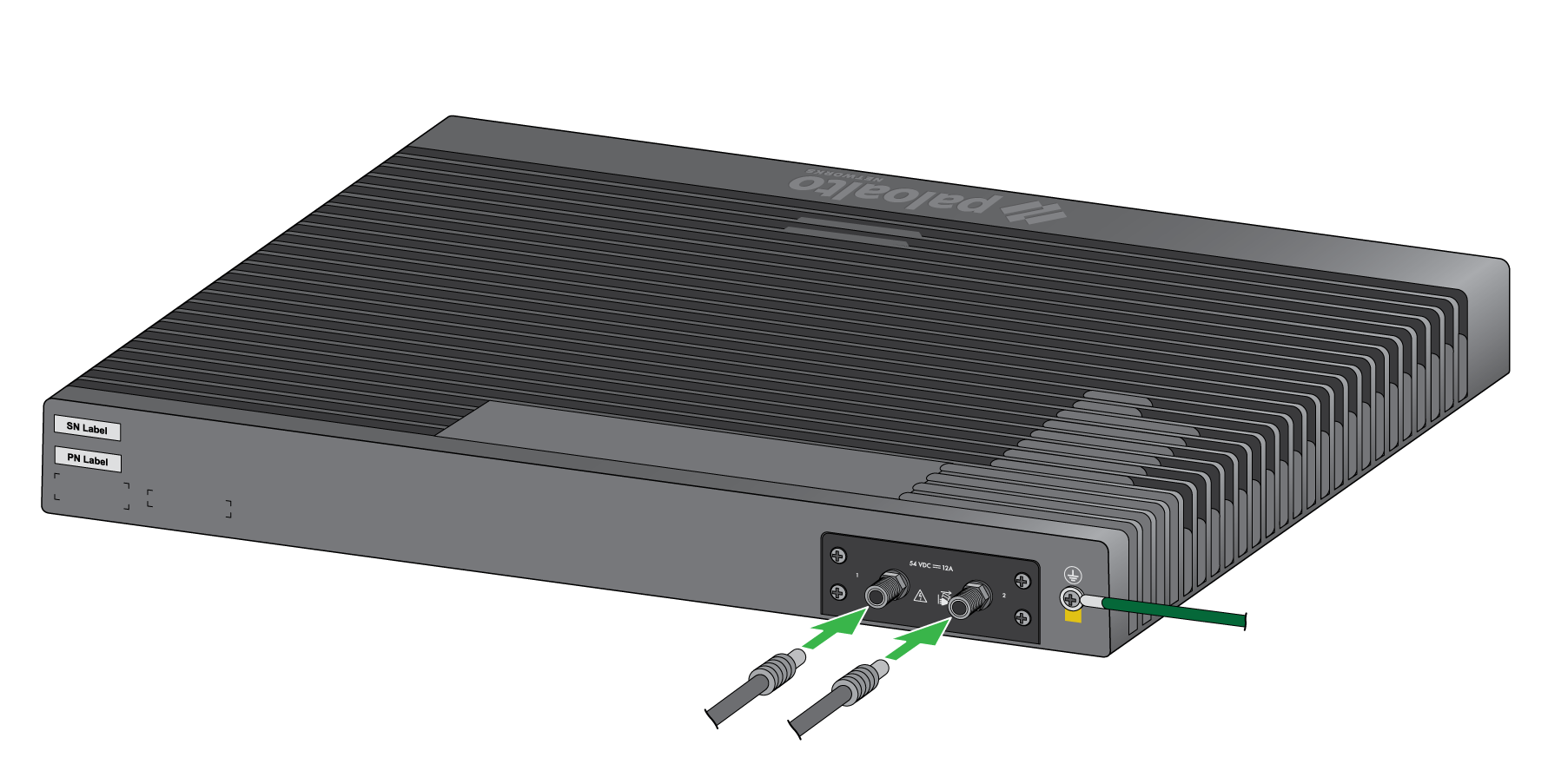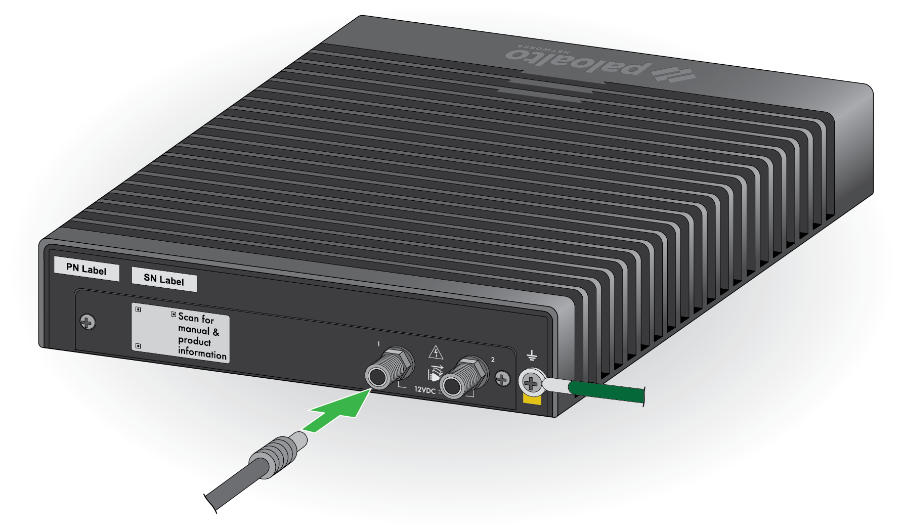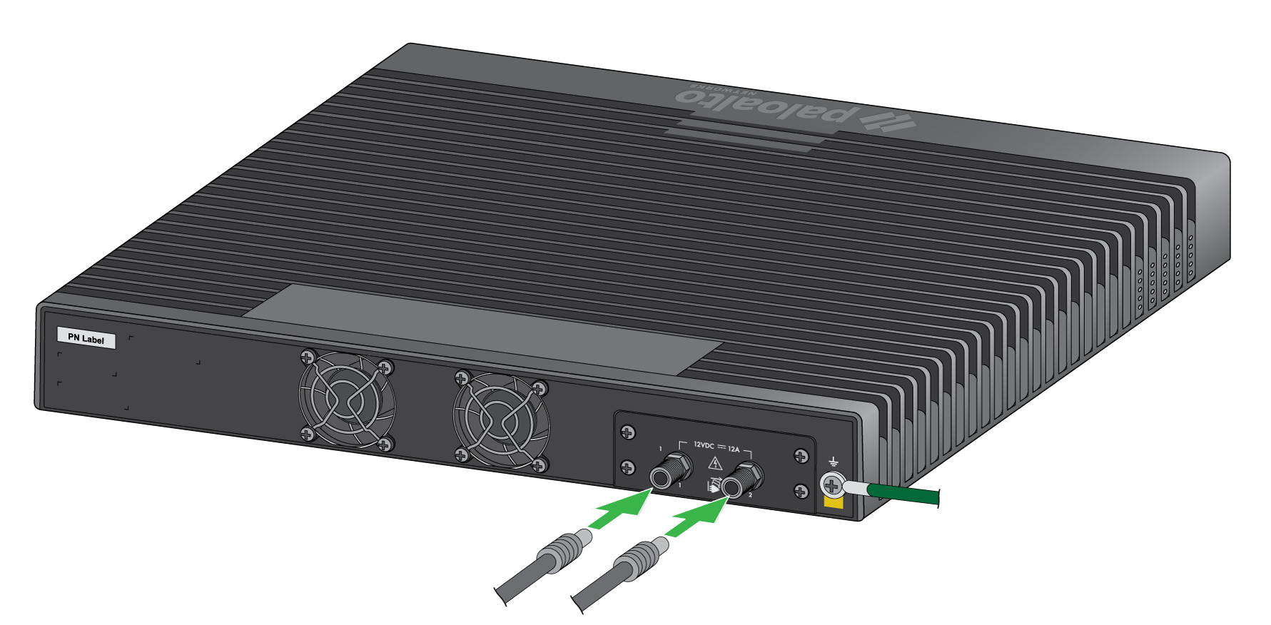 - Make sure that your AC power source is powered off.Remove the screw from the ground point on the back of the firewall.Crimp a 14AWG ground cable to a ring lug (ground cable not included), place the ring lug over the screw, then replace the screw to attach the cable to the firewall. Torque the screw to 25 in-lbs and then connect the other end of the cable to earth ground.Connect the power adapter to the first power input on the back of the firewall.PA-505Insert the DC connector from the power adapter into the port on the back of the firewall. Snap the DC connector cable to the cord retainer.