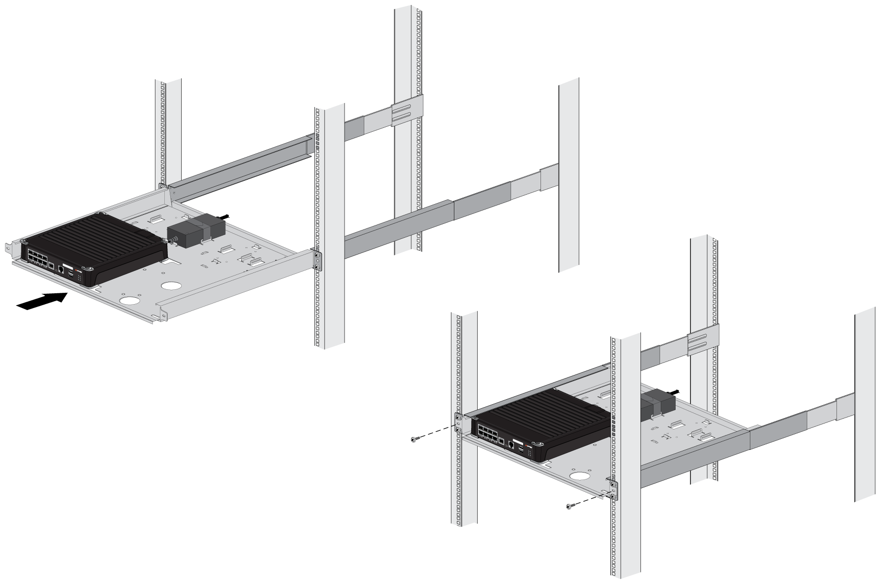 Slide the mounting tray into the rails previously fixed to the equipment rack. Stop when the front flange on the mounting tray is flush with the front of the rail.Align the slotted hole in the mounting tray to the hole in the equipment frame. Secure the mounting tray to the equipment frame on both sides using one screw each (not provided). The screws must be compatible with your equipment frame.PAN-1RU-4POST-RACK-10