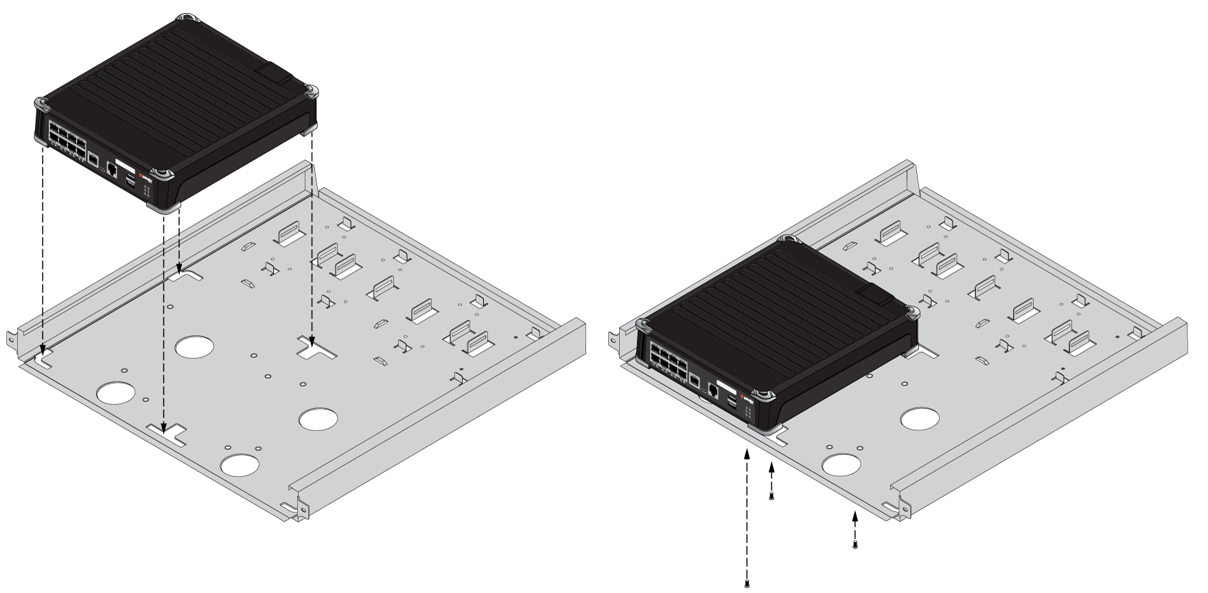 PAN-1RU-4POST-RACK-11 (PA-550 and PA-560)- Align the four rubber feet of the device to the mounting tray, then