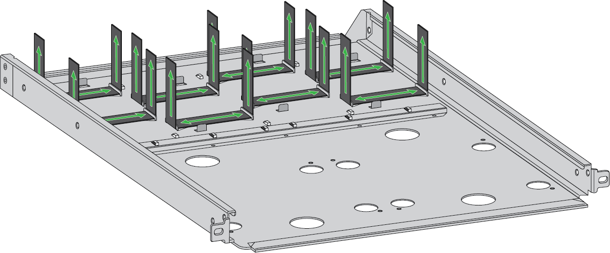 Route the power cables through paths on the mounting tray.PAN-1RU-4POST-RACK-11- Route the initial segment of the power cables (that plugs into the