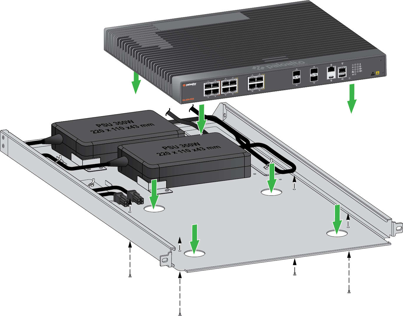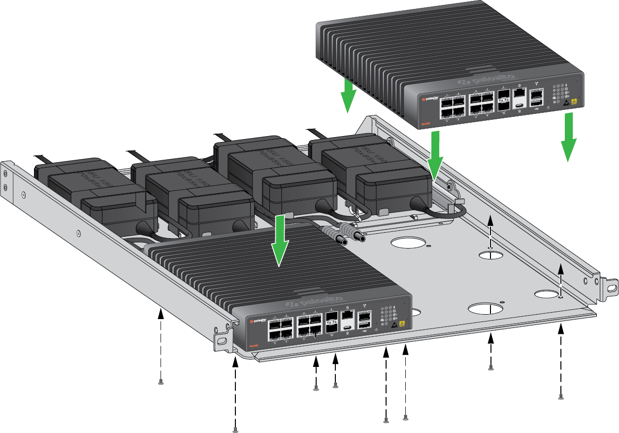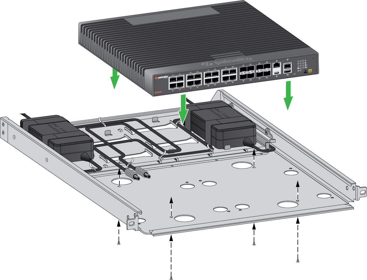 Install the firewall in the mounting tray.PAN-1RU-4POST-RACK-10- Align the four rubber feet of each device to the mounting tray, then