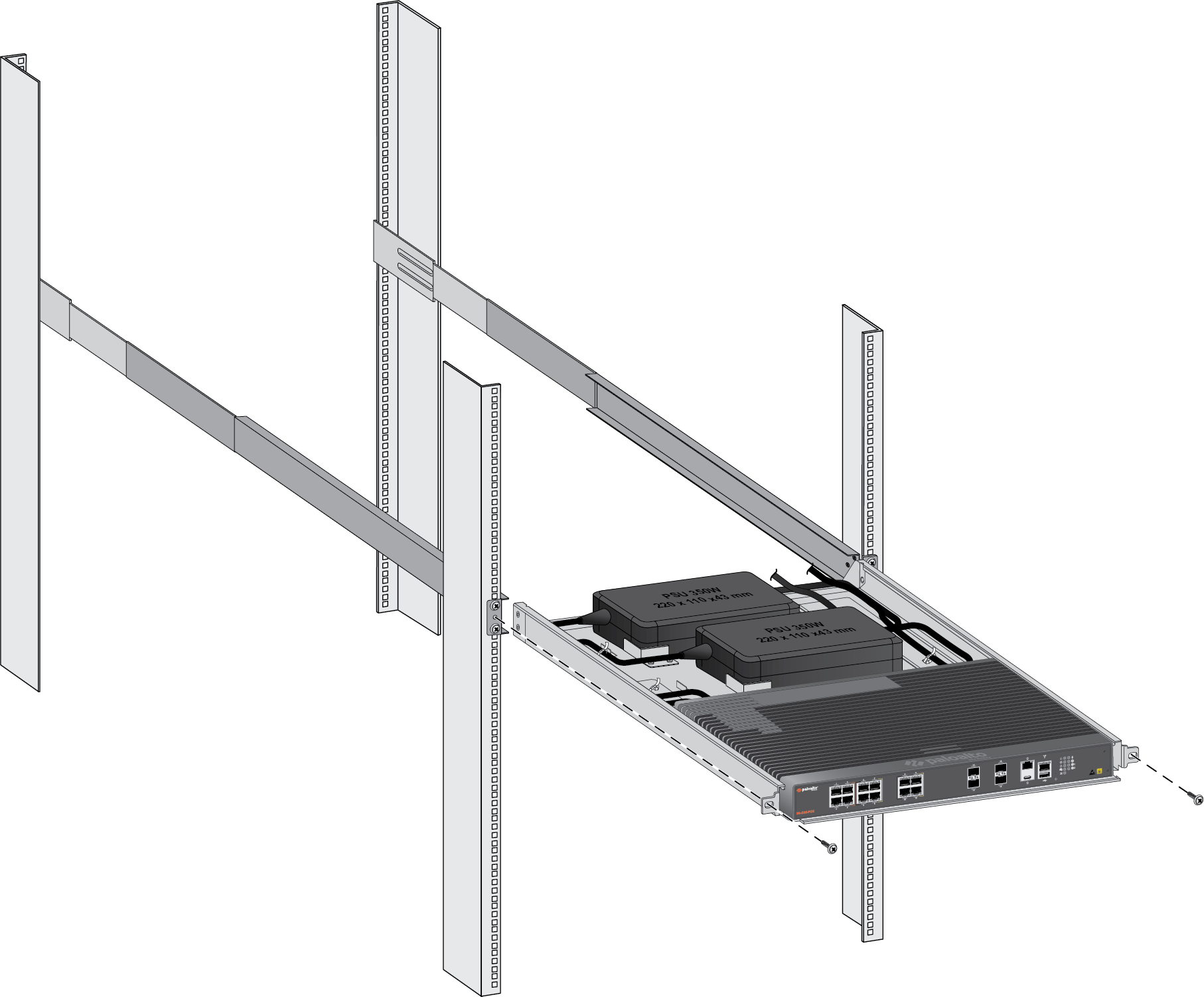Align the bottom edge of the mounting rails to the bottom of the space reserved for your firewall. Align the slotted holes in the adjustable mounting bracket to the holes on the rear of the equipment frame.Secure the rails to the equipment frame with mounting screws (not provided) compatible with your equipment frame. Tighten the screws to their recommended torque value.