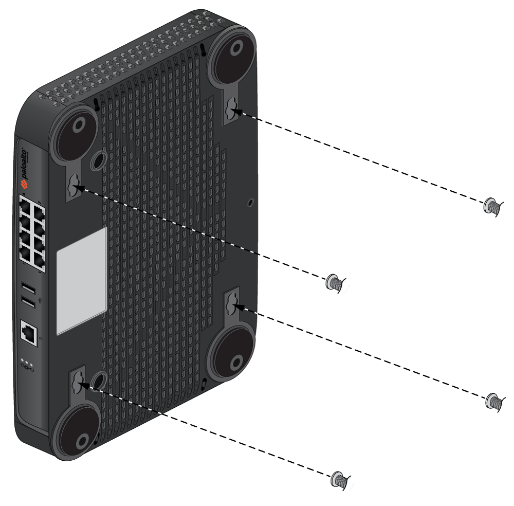 - Mark the locations on the wall that line up with the wall mount holes on the bottom of the firewall.For the PA-505, mark four wall mount hole locations.For the PA-510, mark three wall mount hole locations.Ensure there are no building services (water, gas, or wiring) behind the wall where you intend to install the firewall.Use a #1 Phillips-head screwdriver to install the appropriate screws into each of the three or four marked locations: