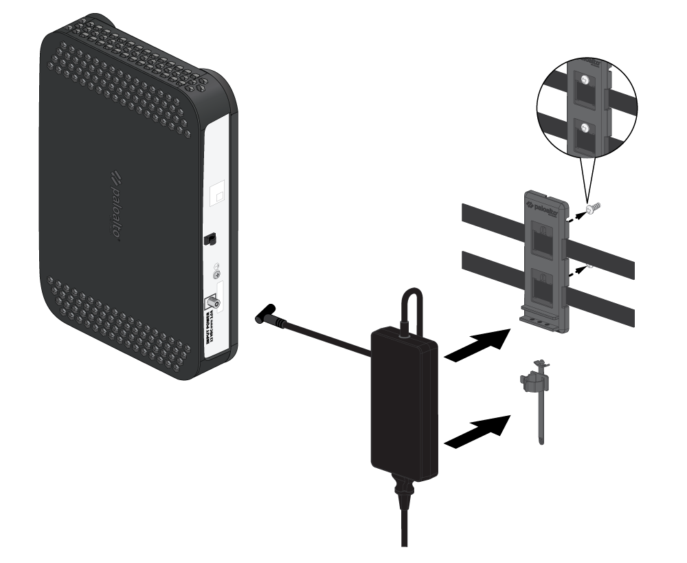 PA-510 — Install the power adapter in the power adapter wall-mount bracket using the Velcro straps and cable tie. Make sure to align the cable tie with the notches in the bracket to prevent the power cord from falling out. Next, loop the two Velcro straps through the side openings on the wall mount and over the power adapter. Lastly, loop the Velcro straps back over the top of the power adapter to secure it into place.Connect the second power adapter through a different circuit breaker to provide power redundancy and allow for electrical circuit maintenance.After you secure the power adapter to the bracket, mount the bracket next to the firewall using wood or drywall screws as appropriate.(PA-505)