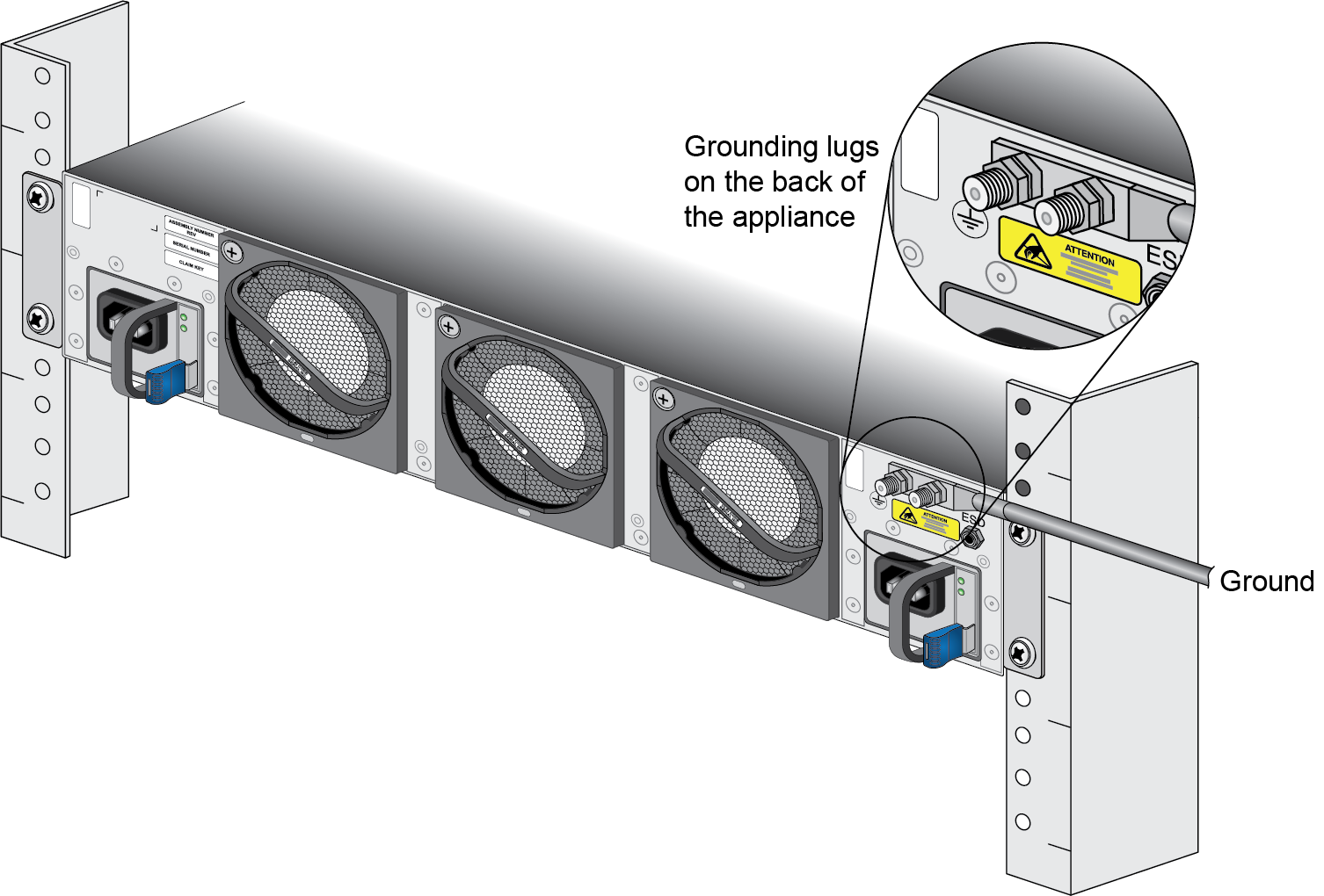 - Read Product Safety Warnings.Put the provided ESD wrist strap on your wrist ensuring that the metal contact is touching your skin. Then attach (snap) one end of the ground cable to the wrist strap and remove the alligator clip from the banana clip on the other end of the ESD grounding cable. Plug the banana clip end into one of the ESD ports located on the back of the appliance before handling ESD sensitive hardware. For details on the ESD port location, see PA-5400 Series Back Panel.For DC deployments, ensure that your DC power feed is powered off.Remove the four nuts from the ground studs located on the back of the appliance on the upper left side.
