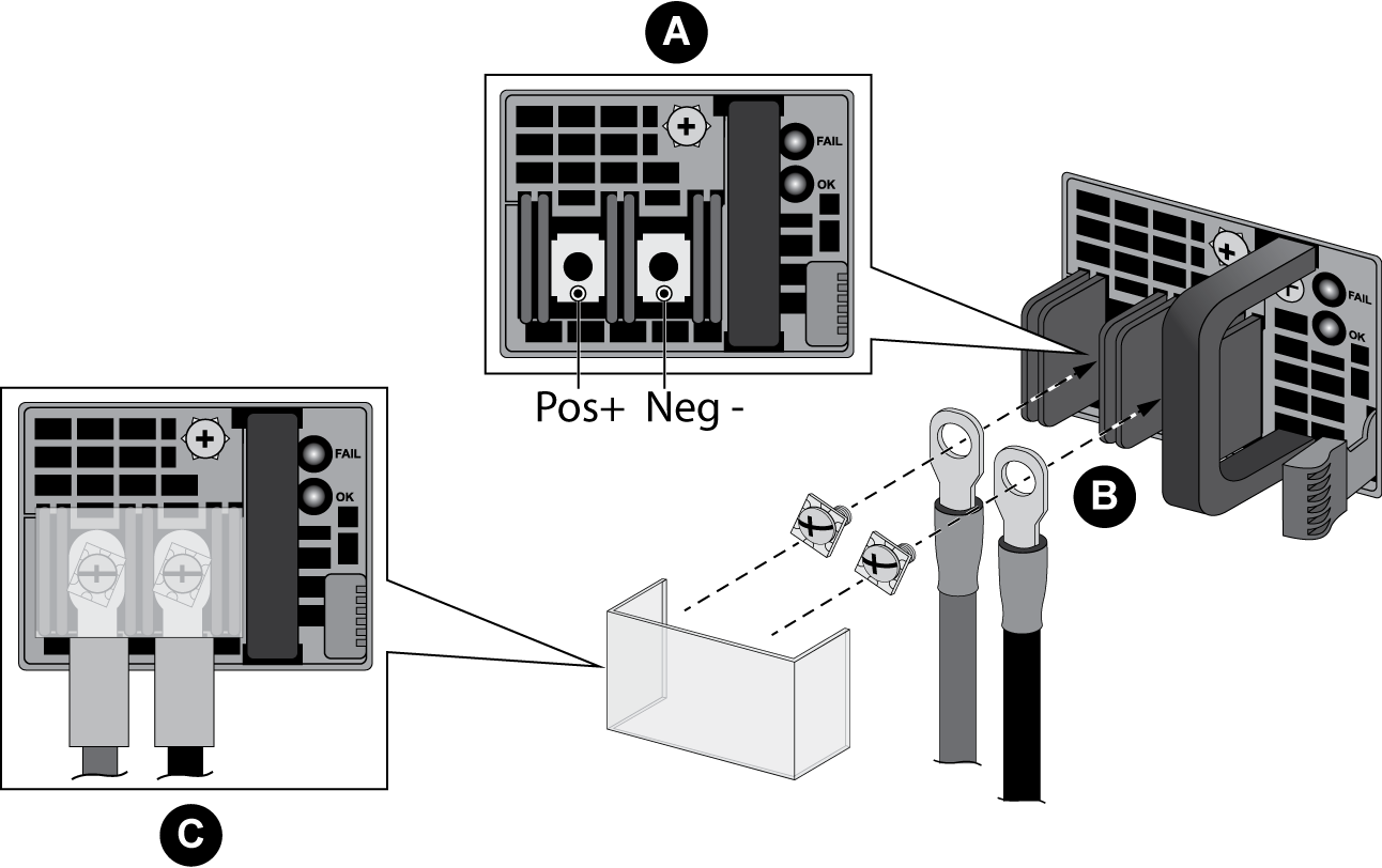 - Use the DC terminal screws to connect a positive (red) DC power cable to the positive terminal on the first DC power supply and then connect a negative (black) DC power cable to the negative terminal. Repeat this step for the second DC power supply using separate positive and negative cables.