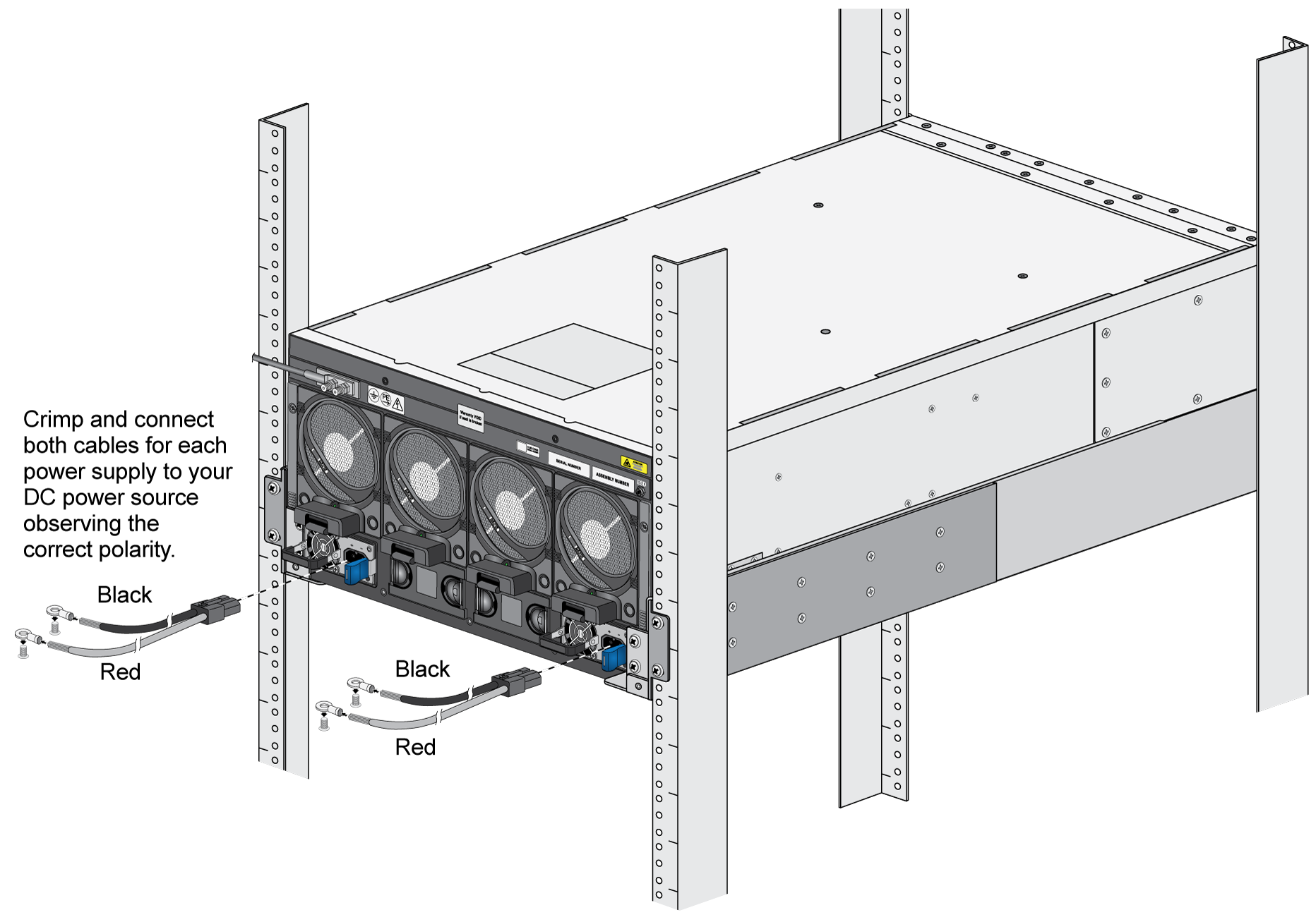 (DC Power Supplies only)- Prepare the DC power cable by crimping the bare wire ends of the cables using lugs (not included) designed for your DC power source. Each cable dongle has one red wire and one black wire. Connect the red wire to the DC negative (-48VDC) terminal of your DC power source. Connect the black wire to the DC positive (RTN) terminal of your DC power source. Do this for each of the four power supplies, ensuring that the first two power supplies on the left are connected to one power circuit breaker and the second pair on the right is connected to a different circuit breaker. This ensures power redundancy and allows for planned electrical circuit maintenance.