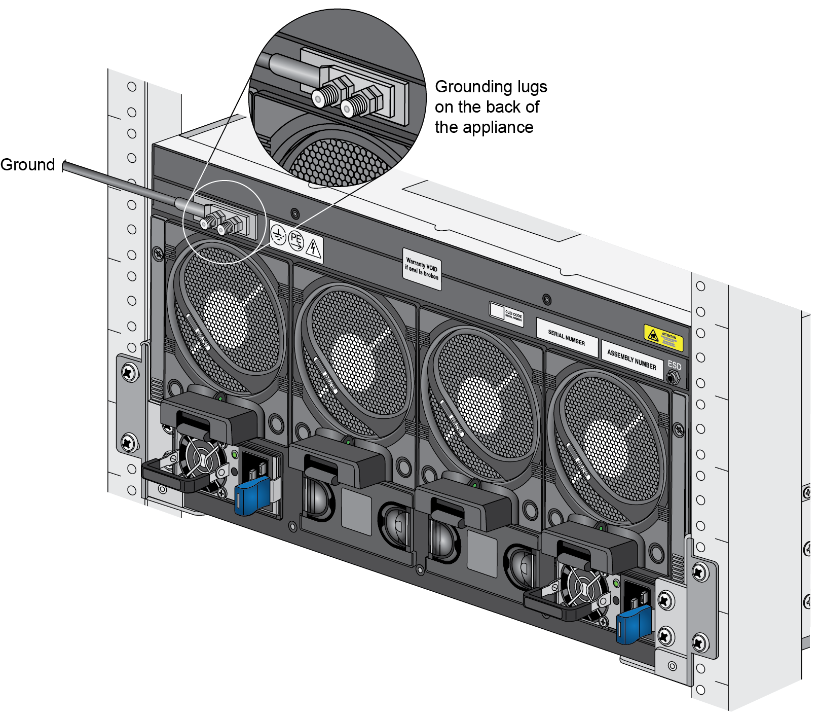 - Read Determine PA-5450 Firewall Power Configuration Requirements to ensure that you understand the available power options and that you provide enough power to the firewall based on your configuration.Read Product Safety Warnings.Put the provided ESD wrist strap on your wrist ensuring that the metal contact is touching your skin. Then attach (snap) one end of the ground cable to the wrist strap and remove the alligator clip from the banana clip on the other end of the ESD grounding cable. Plug the banana clip end into one of the ESD ports located on the back of the appliance before handling ESD sensitive hardware. For details on the ESD port location, see PA-5450 Back Panel.For DC deployments, ensure that your DC power feed is powered off.Remove the four nuts from the ground studs located on the back of the appliance on the upper left side.