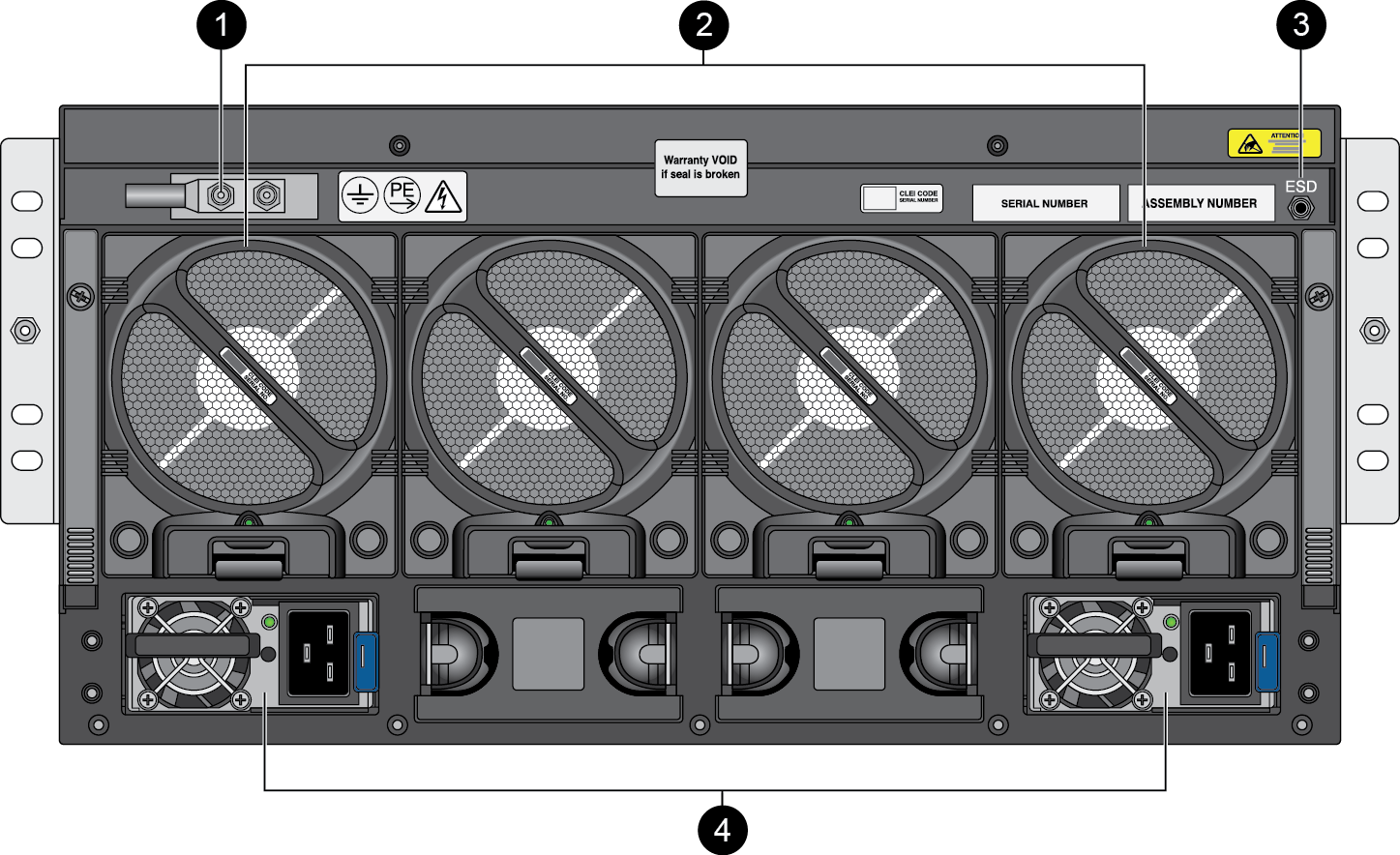 Provide the appliance with cooling and ventilation. There are four dual-rotor fan assemblies that can be individually replaced. While facing the rear of the firewall, the fan assemblies are labeled 1, 2, 3, and 4 from left to right.
