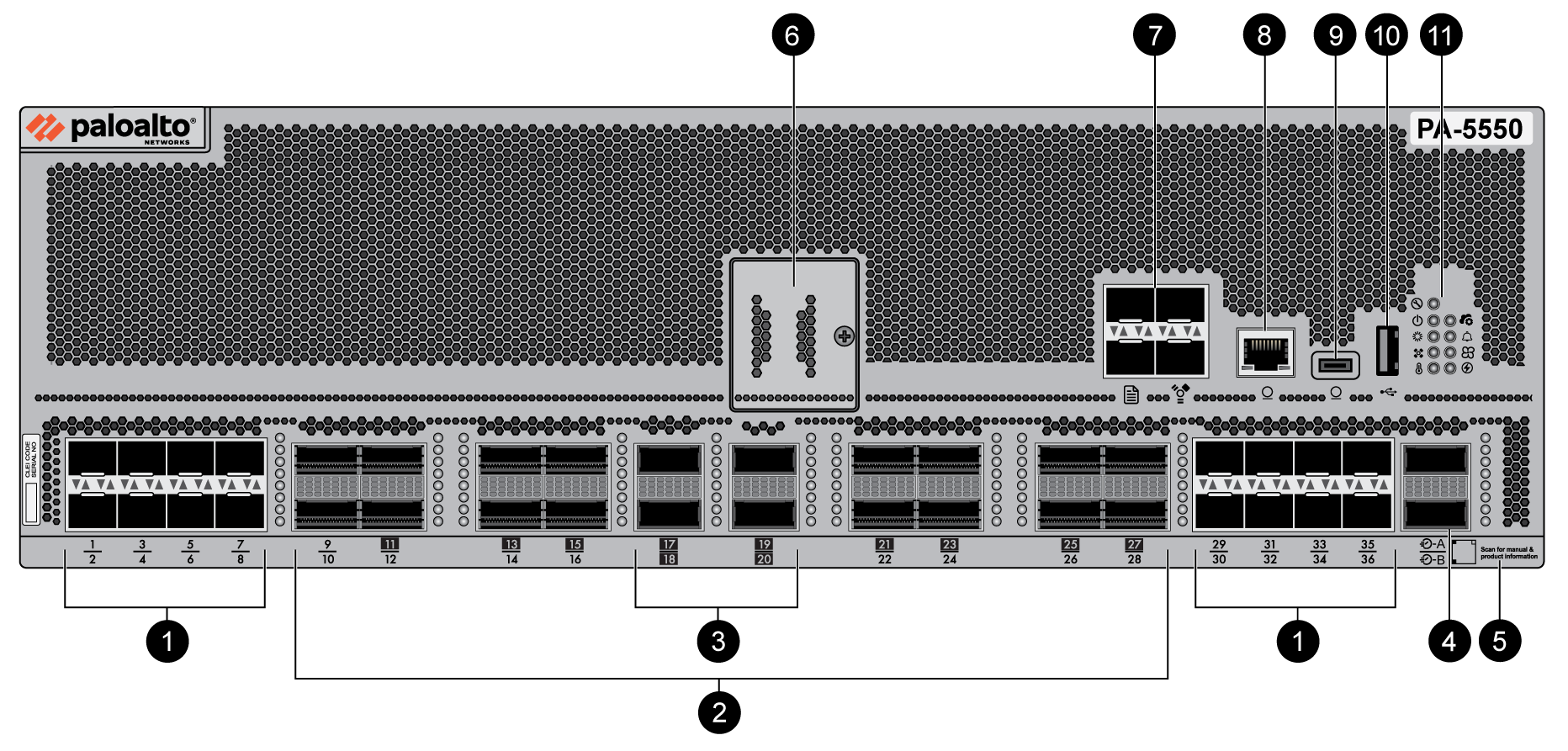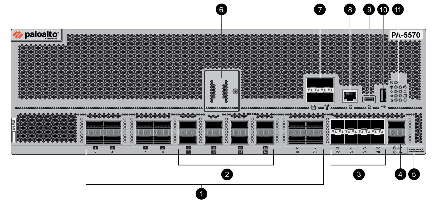 The following image shows the front panel of the PA-5560, PA-5570, and