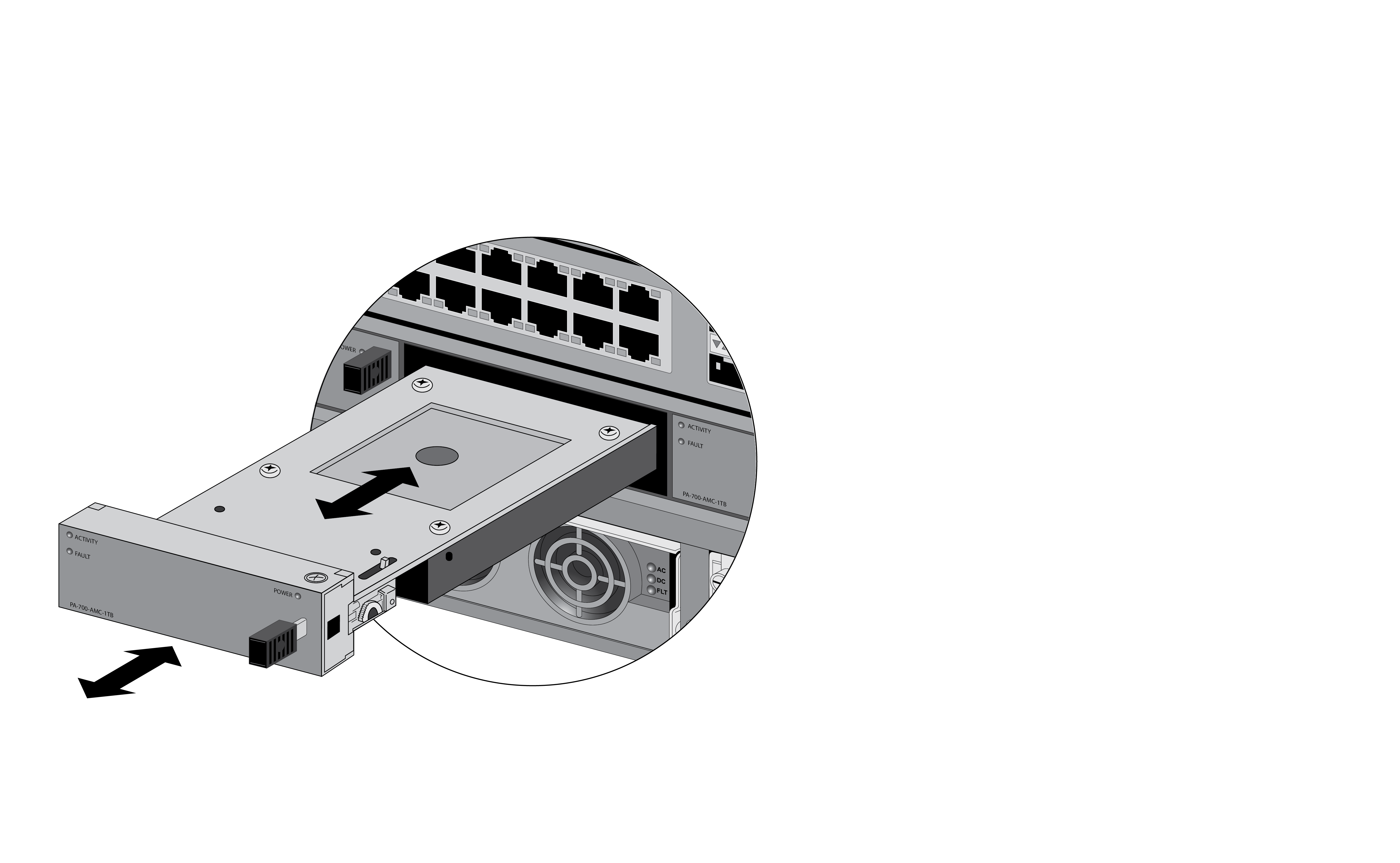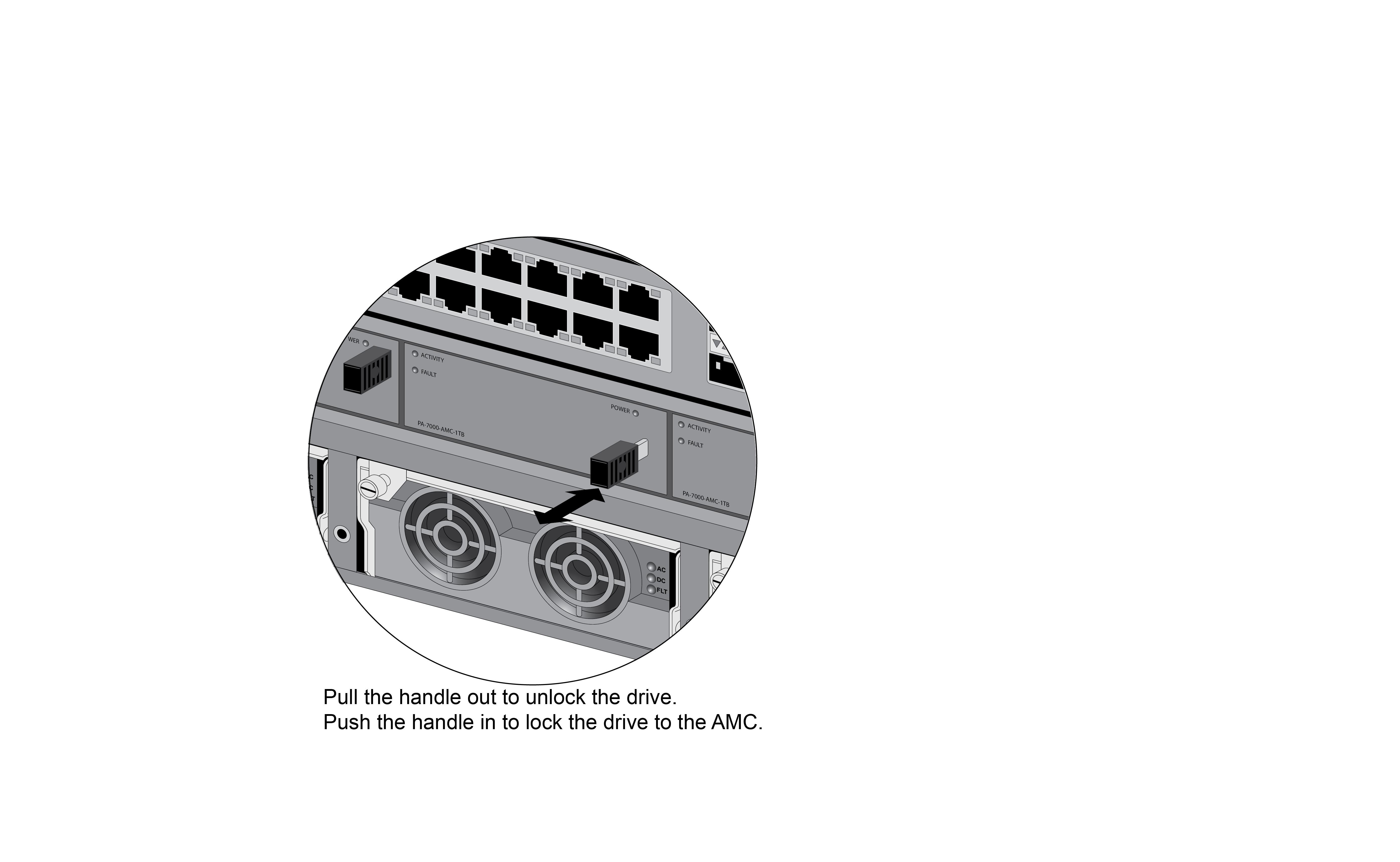 admin@PA-7080> request system raid slot s7 remove A1This procedure is based on a PA-7080 firewall where the LPC is installed in slot s7. If you are working on a PA-7050 firewall, the LPC is installed in slot s8. For a PA-7050 firewall, replace slot s7 with slot s8 in those commands that specify the LPC slot number.Gently pull the AMC release handle on drive A1 toward you until it stops to unlock the AMC from the chassis and then completely remove the AMC.