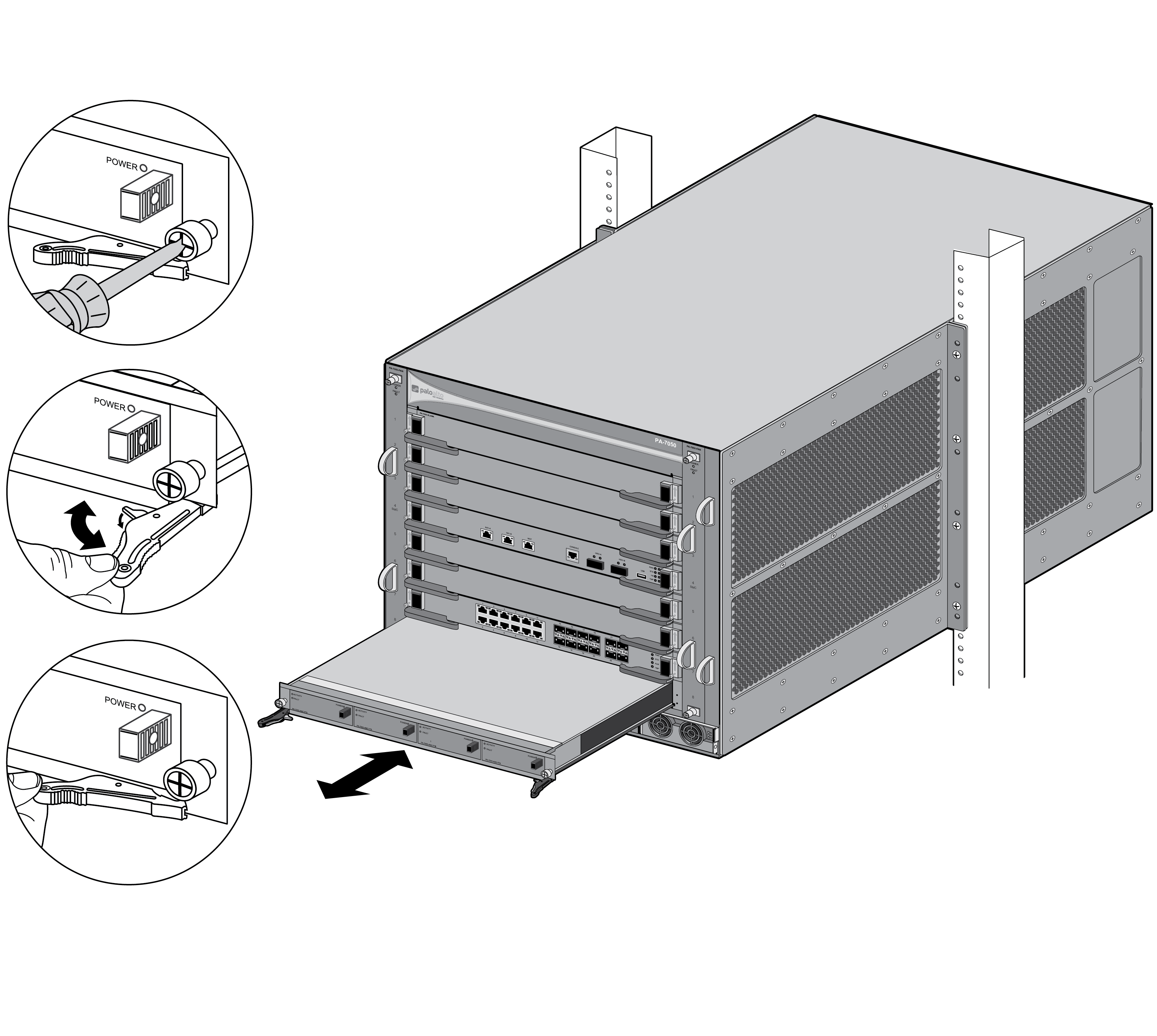 - Power off the chassis and disconnect the power source to the chassis.Put the provided ESD wrist strap on your wrist ensuring that the metal contact is touching your skin. Then attach (snap) one end of the ground cable to the wrist strap and remove the alligator clip from the banana clip on the other end of the ESD grounding cable. Plug the banana clip end into one of the ESD ports located on the front of the chassis before handling ESD sensitive hardware. For details on the ESD port location, see PA-7050 Front Panel (AC) or PA-7080 Front Panel (AC).Remove the four drives from the front of the LPC and note the location of each drive. For details on removing the drives, see Replace a PA-7000 Series Firewall LPC Drive.It is important that you reinstall the drives in the same position from which you removed them to maintain the RAID configuration. It is best to label the drives and take a picture before removing them.Loosen the thumb screws on each side of the LPC.Remove the LPC by pulling the inner release lever to unlock the outer release lever and then use the outer release lever to pull the LPC out of the chassis.The LPC has a double-lever on each side of the card. After loosening the thumb screws, you must pull the inner lever toward you to unlock the outer lever from the chassis and then pull the outer lever to release the card. When installing the card, push the outer lever in to lock the inner lever.
