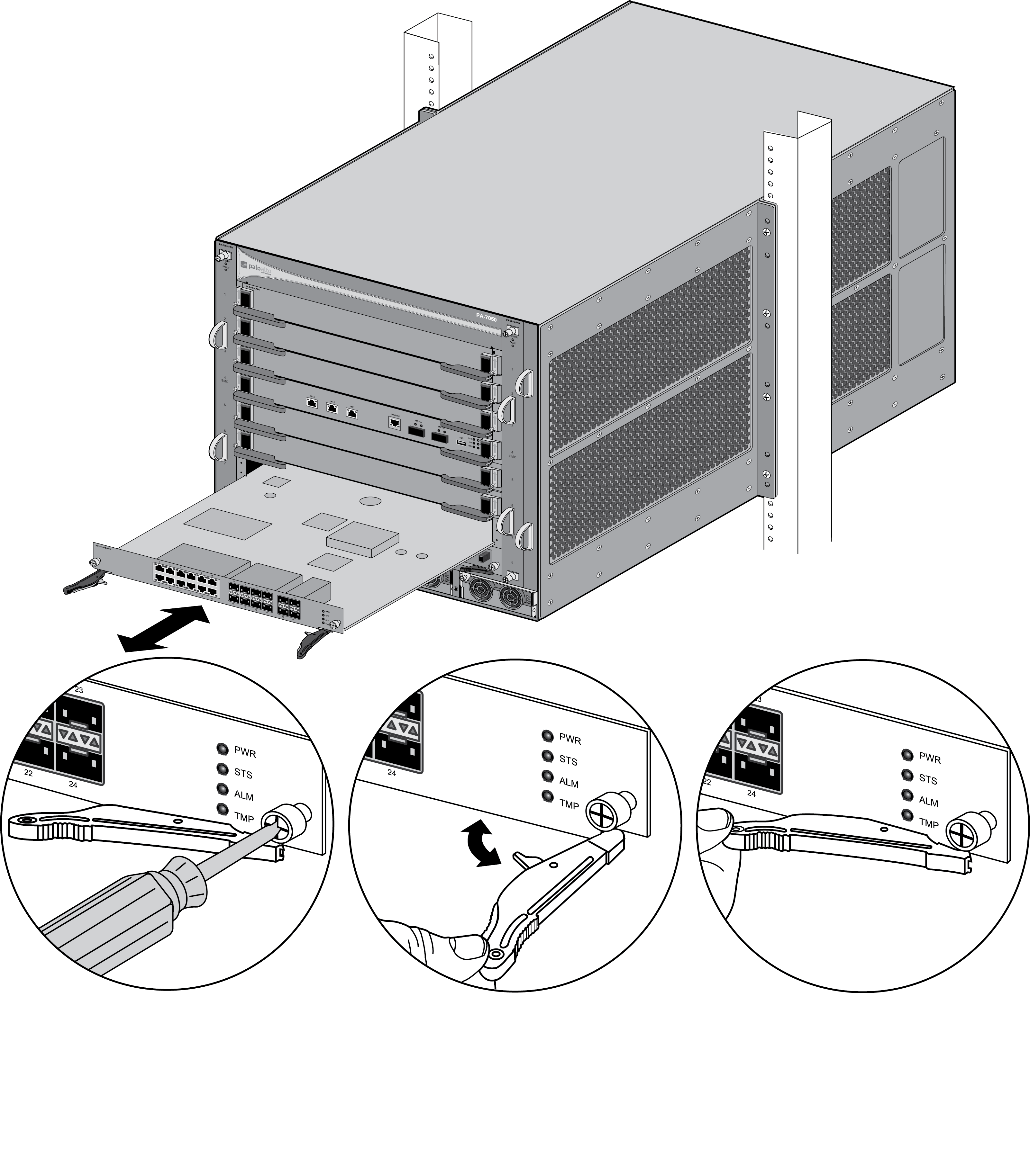 Remove the replacement NPC from the antistatic bag and slide it into the empty slot, ensuring that the handles are in the open position. When the card is about 1/4-inch from being fully inserted, adjust the levers to align with the chassis and then close the levers to seat the card in place.The small notches located near the hinge of the card levers are used to fully seat the card into the back connector of the slot. To prevent damage, ensure that the notches line up with the chassis so that when you close the levers, the levers fully seat the card into the backplane connectors.Tighten the screws on each side of the NPC with a Phillips-head screwdriver to secure it to the chassis.Insert the network cables that you removed earlier.For slot status information and troubleshooting, see the following sections: PA-7000 Series Front Slot States and PA-7000 Series Firewall Network Processing Card (NPC) Troubleshooting Commands.
