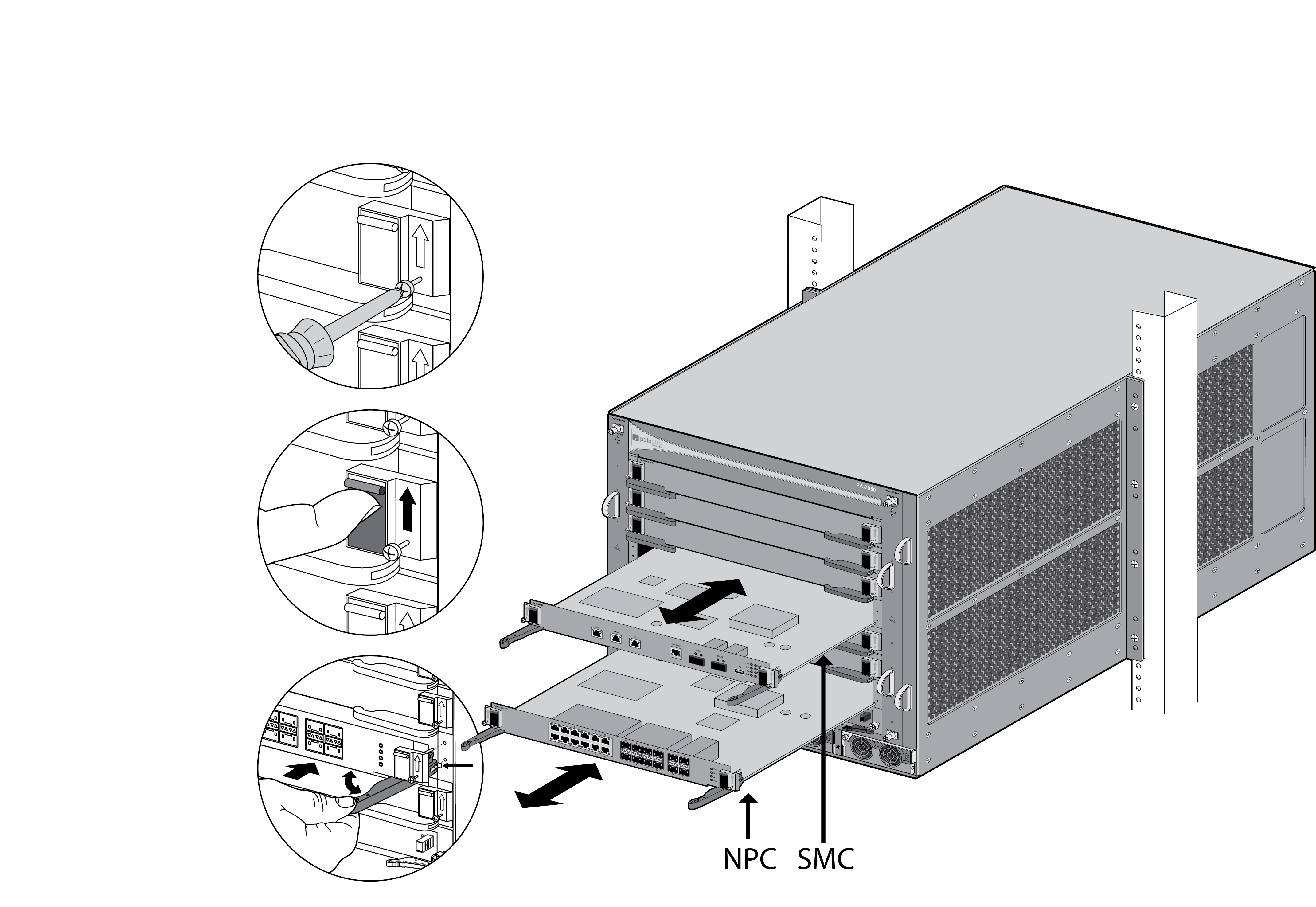 If the NPC failed due to a hardware problem, the status shows Failure. The NPC may also have a configuration problem, in which case you can run the commit force command to try and force a commit.Make note of the cable connections and then loosen the screws on each side of the NPC.Releasing the eject levers on the NPC will trigger a micro switch that powers down the card to prepare it for removal. Only release the levers if you intend to remove the card.Put the provided ESD wrist strap on your wrist ensuring that the metal contact is touching your skin. Then attach (snap) one end of the ground cable to the wrist strap and remove the alligator clip from the banana clip on the other end of the ESD grounding cable. Plug the banana clip end into one of the ESD ports located on the front of the chassis before handling ESD sensitive hardware. For details on the ESD port location, see PA-7050 Front Panel (AC) or PA-7080 Front Panel (AC).Remove the NPC using the appropriate procedure below depending on the version of the installed NPC. There are two versions of the NPC. Version 1 has a black slide switch on each side of the card that is used to release the ejector lever. Version 2 does not use the slide switch; instead it uses a double-lever design where you use an inner lever to release the outer ejector lever before you can use the outer ejector lever to remove the NPC.Removing a version 1 NPC—Turn the card screws on each side of the card counterclockwise until loose and then slide the black lever release switch upward on both sides to unlock the release levers and then wait for the green power LED to turn off. After the power LED is off, pull the outer ejector release levers toward you to pull the card out of the chassis.Removing a version 2 NPC—Turn the card screws on each side of the card counterclockwise until loose and then gently pull the inner release lever to release the outer ejector levers. Wait for the green power LED to go off and then pull the release lever toward you to pull the card out of the chassis.The following images show the two versions of the PA-7000 NPCs.Install or Remove a PA-7000 Version 1 NPC