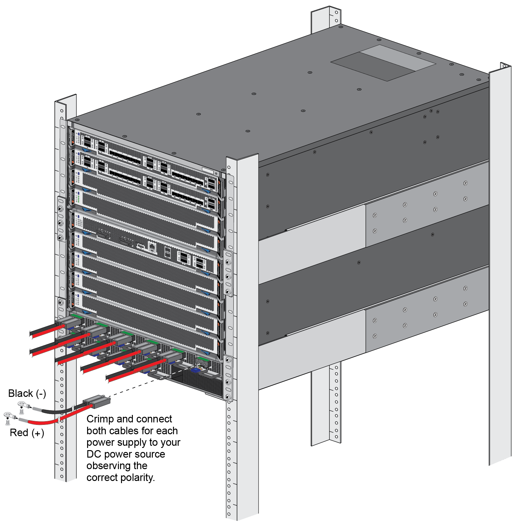 Crimp a 6-AWG wire to the provided grounding lug and connect the other end to your earth ground point.The crimp tool is not included with the appliance. It is recommended that you use a Panduit CT-3001/ST crimp tool for this procedure. Refer to the manufacturer’s specifications for more information.Connect the two-post lug connector to the two-post ground studs on the appliance using the provided nuts and torque each nut to 50 in-lbs. Be careful not to strip the nuts and lug studs.Prepare the DC power cable (not included) by crimping the bare wire ends of the cables using lugs (not included) designed for your DC power source. Each cable dongle has one red wire and one black wire. Connect the red wire to the DC negative (-48VDC) terminal of your DC power source. Connect the black wire to the DC positive (RTN) terminal of your DC power source. Do this for each of the power supplies you are installing, ensuring that each pair of power supplies is connected to its own power circuit breaker. This ensures power redundancy and allows for planned electrical circuit maintenance.Connect the other ends of the cables to the front of the DC power supplies by pushing the connectors into each DC power supply until it is secure.The DC power supplies ship with the necessary 3m-long 2AWG cables (pictured below).