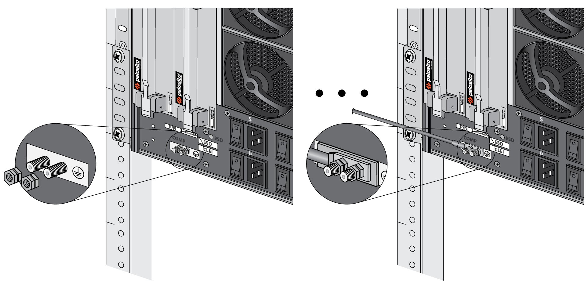 - Read the Product Safety Warnings.Put the provided ESD wrist strap on your wrist ensuring that the metal contact is touching your skin. Then attach (snap) one end of the ground cable to the wrist strap and remove the alligator clip from the banana clip on the other end of the ESD grounding cable. Plug the banana clip end into one of the ESD ports located on the appliance before handling ESD sensitive hardware.Ensure that your DC power feed is powered off.Remove the four nuts from the ground studs located on the back of the appliance.