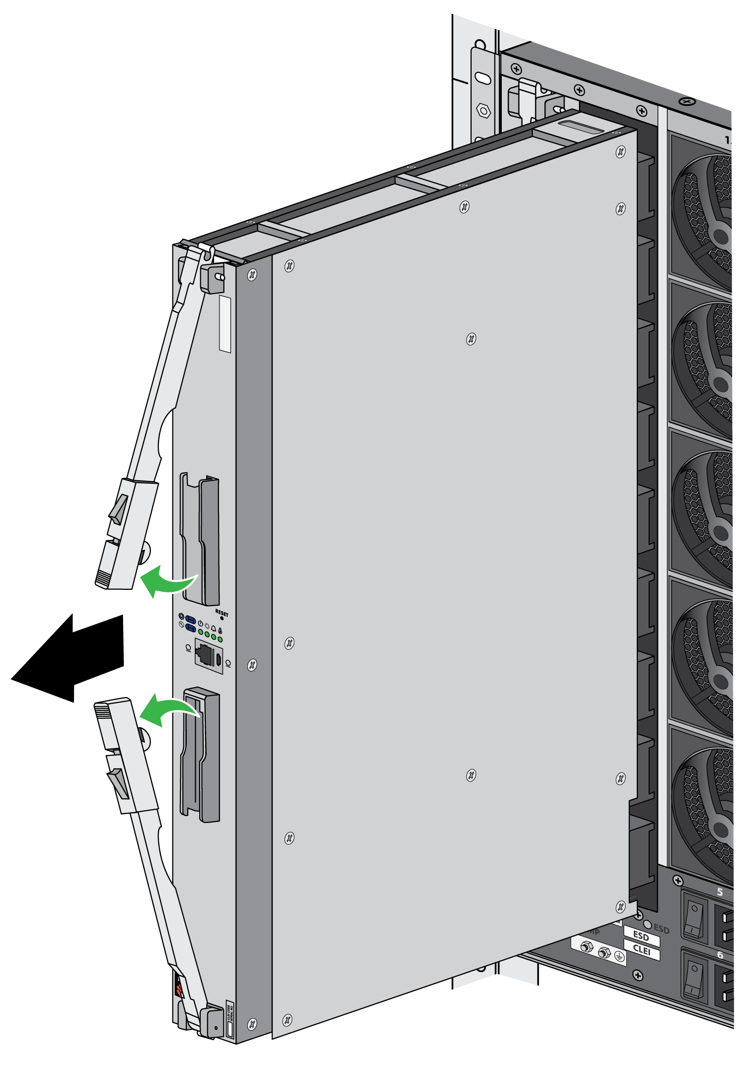 Grip the ejector handles and gently pull the card out of its slot.The cards are heavy and should be removed and replaced in their antistatic bags on a table or other flat, stable surface. Ensure that the card connectors do not make contact with other surfaces or objects.Retrieve your replacement card and install it into the appropriate slot.The following chassis front slots (numbered from top to bottom) can support the following interface cards:- 1—NPC and DPC