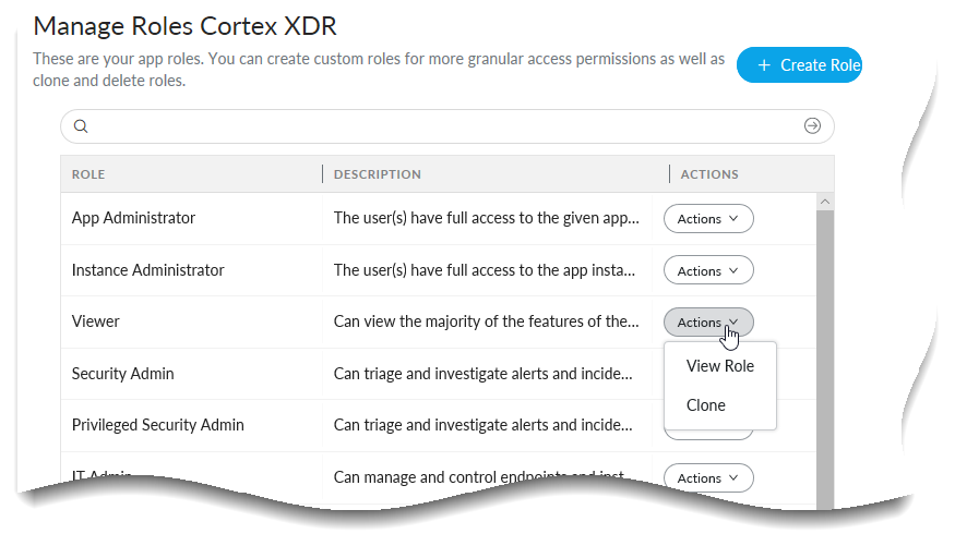 Click Clone.To see the permissions that the role grants, click View Role if that role is a predefined app role or Edit Permissions if it is a custom role.To modify the name, description, and permissions of your cloned role:- Select the dropdown of your cloned role.Select Edit Permissions.Change the ROLE LABEL , DESCRIPTION, or PERMISSIONS.Save your changes.To assign your new role, select it when you assign roles for app instances.