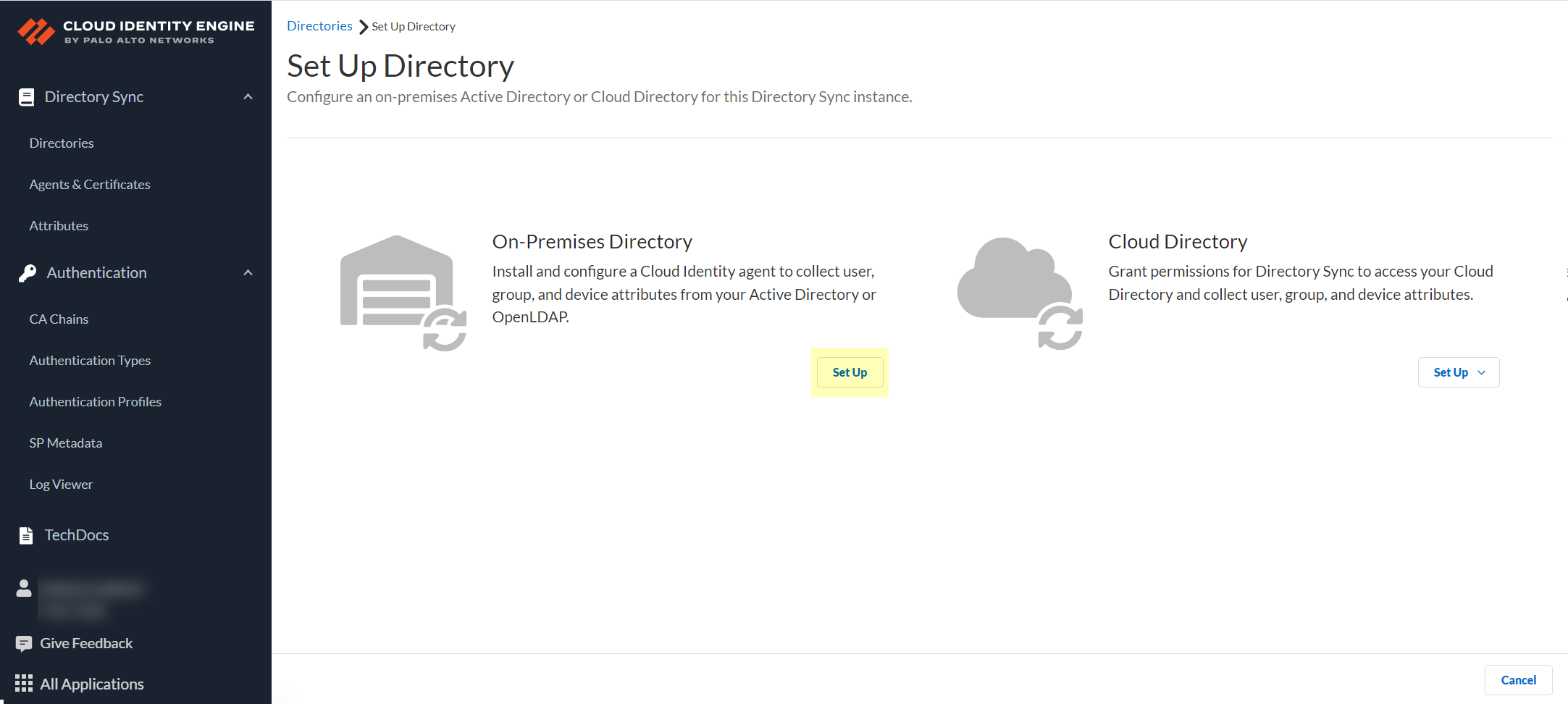 - Log in to the hub and select the Cloud Identity Engine app.Select Directories then click Add New Directory.