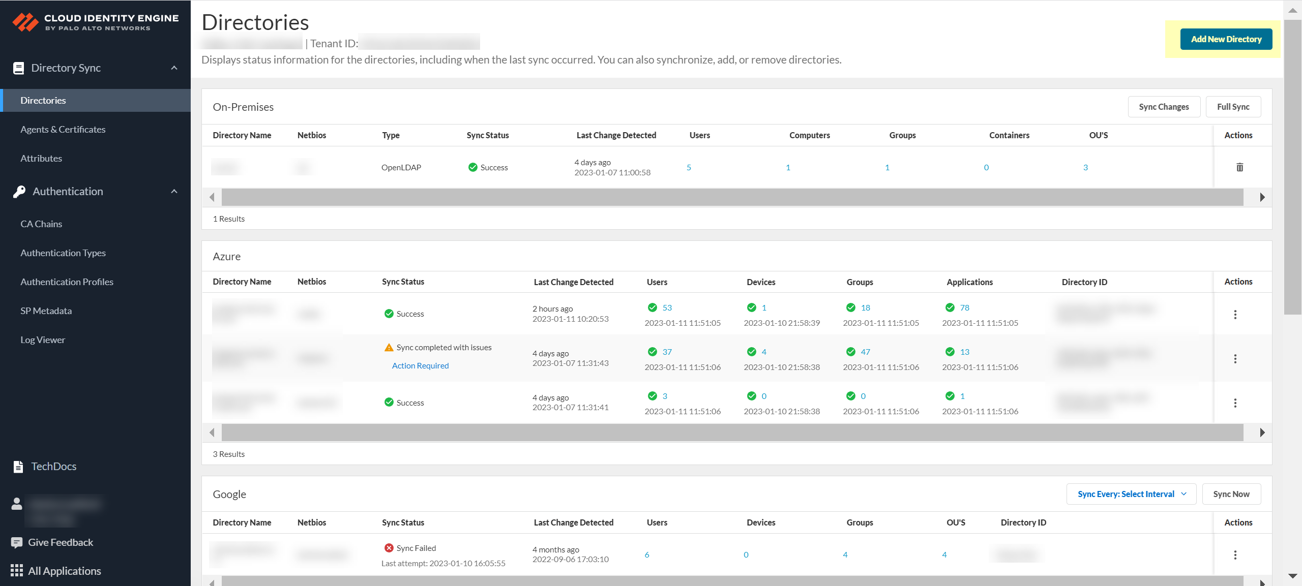 | The Cloud Identity Engine service is free; however, the enforcement points utilizing directory data may require specific licenses. Click here for more information. |