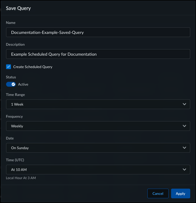 - Toggle the Status if you want to enable the scheduled query after saving.The Status is "Disabled" by default when you first schedule a query.Select the Time Range of how far back the query should search for devices.Select the Frequency for how often the scheduled query should run.Select the Time (UTC) for when the scheduled query should run.