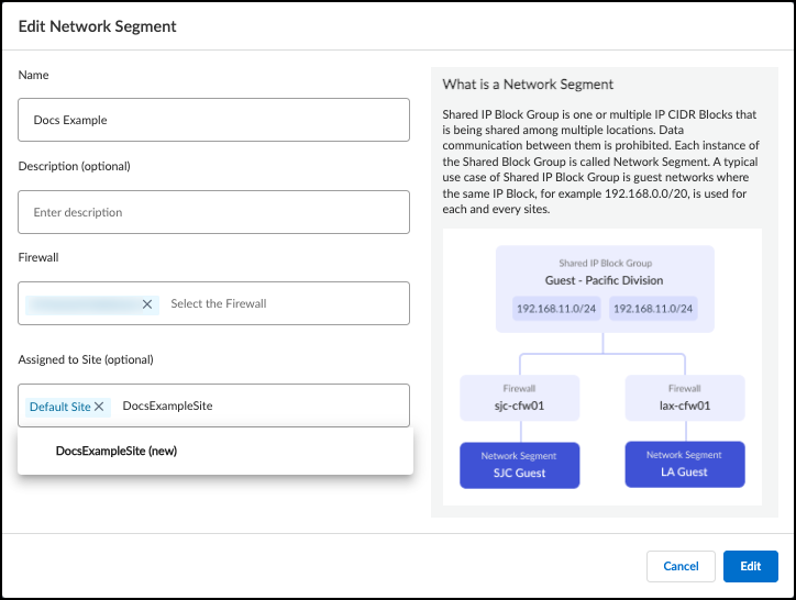 Select Edit to save your changes and close the dialog box.Select the check box next to the updated network segment and Reset the network segment.Optional If you moved a firewall from one network segment to another, select the network segment that the firewall was removed from and Reset that network segment.Update the Site Assignment from Network Segments