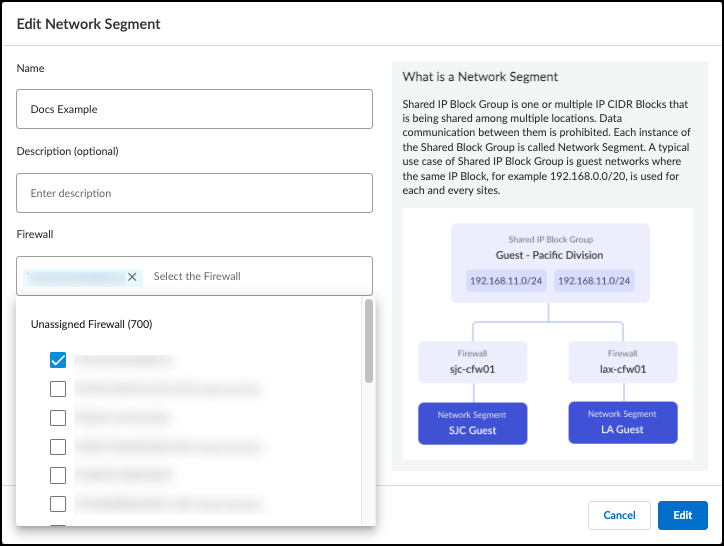 - Navigate to NetworksNetwork Segments.Click on the name of the network segment that you want to update to bring up the Edit Network Segment dialog box.In the Firewall field, add or remove firewalls.You can search by a firewall's serial number and name, or use the drop-down selector. The drop-down selector shows if firewalls are assigned to a network segment or not, including the network segment you're editing. If you select a firewall that is assigned to a different network segment, it's removed from its existing network segment after saving the configuration. There must be at least one firewall assigned to the network segment.