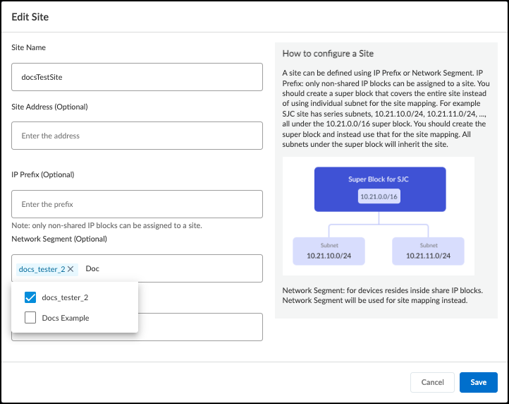 - In the Sites table, find the site that the network segment belongs to.Click the three vertical dots at the far right of the row and select Edit Site to bring up the Edit Site dialog box.In the Network Segment (Optional) field, add or remove network segments assigned to the site.If you remove a network segment from the site, the network segment is reassigned to the default site after saving the configuration.If you add a network segment, it is removed from its existing site after saving the configuration.