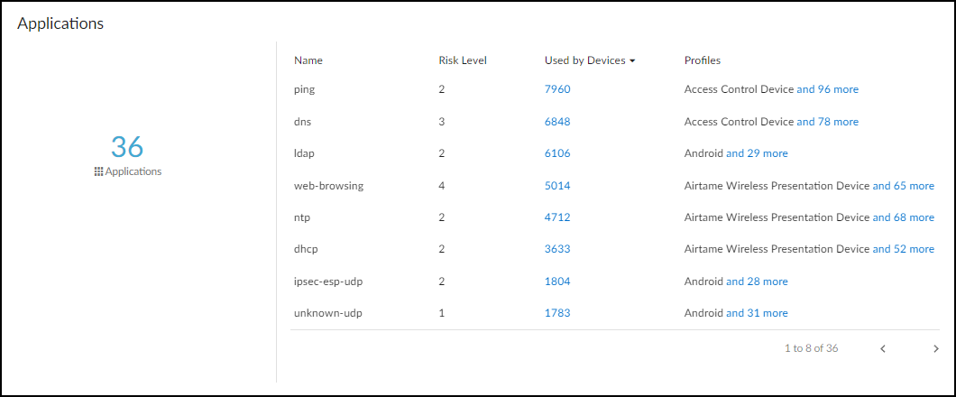 Any node with “S” on it is a server.To learn more, watch a pair video explanations of the Topology Explorer. Part 1 covers navigation, information pop-ups, zoom, device category filters, and SMB filters. Part 2 looks at the information panel, how to explore the topology, and how to start a new path. Each video is about two to three minutes long. - Applications: This section shows the applications the device uses, their risk levels (a 1-5 scale with numbers closer to 5 indicating increased risk), and how many other devices and device profiles use the same application. Click a number in the Used by Devices column to open the Devices page with its contents filtered by the corresponding application. Hovering your cursor over the blue text of an entry in the Profiles column displays a list of all profiles that use that application.