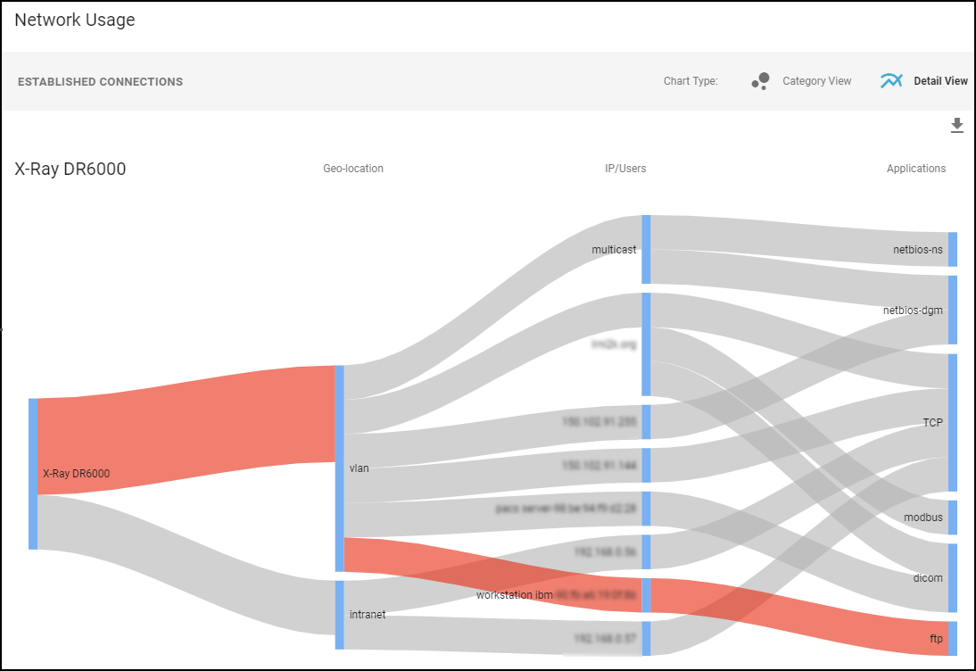 The amount of data Device Security learns is limited to whatever SBOM information devices send over the network and by what can be extracted from network traffic. - Network Usage: The last section shows a Sankey diagram with lines indicating network connections. The red line indicates it’s involved in an alert of high severity. Click one of the blue bars and then click the Create Policy option that appears to create a policy with the following fields in the Policy Editor auto filled: (“Group #1” = source, and “Group #2 = destination).