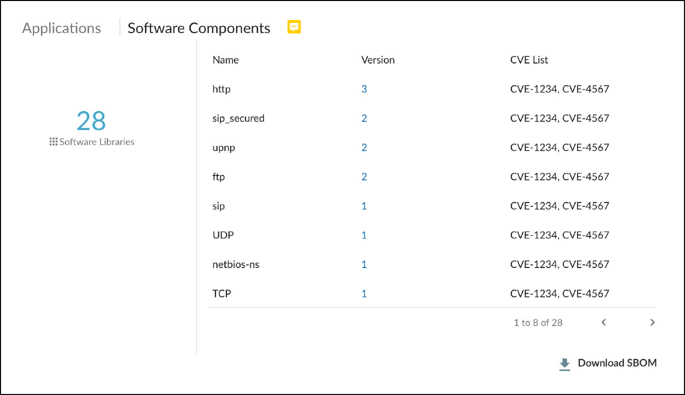 - Software Components: Most software makes use of various third-party software components such as libraries, modules, binaries, compilers, executables, files, and source code. The details of these components are increasingly being documented within Software Bills of Materials thanks to the Software Component Transparency initiative led by the U.S. National Telecommunication and Information Administration and with the participation of numerous manufacturers. A Software Bill of Materials (SBOM) is a comprehensive record detailing all the bits and pieces of software within a system or device and their relationships with each other. It’s essentially a nested inventory of software components and subcomponents, including firmware and embedded software. It also typically includes licensing, author, and version information plus other metadata. The purpose is to provide as much transparency as possible into the software contents running on devices so that we can better protect them from attack.Some exploits specifically take advantage of the very lack of transparency and target vulnerabilities that occur in software components such as Spring4Shell, Urgent/11, Ripple20, and Log4j 2. Knowing which software components are on a device can expedite vulnerability detection, risk analysis, and remediation efforts. For example, the Log4j 2 vulnerability affects specific versions of the Apache Log4j 2 Java logging library, an open-source Java-based logging framework used by Java applications around the world. Attackers can exploit the vulnerability to launch denial-of-service attacks or gain remote control of target devices. The first step in responding to this threat is to identify which devices use the Log4j 2 Java logging library and, if so, if it’s a vulnerable version. With Device Security, you can search your inventory for devices using this particular library and version–or for devices vulnerable to one or more of the related CVEs–in just seconds and save days or even weeks of response time.Device Security primarily learns SBOM information from traffic inspection of, for example, the user agent field in HTTP headers and to a lesser degree from other sources like FTP banners and HTTP URL information. It then shows the software components and version numbers identified in the SBOM for a device in the Software Components column on the Devices page. Device Security also shows the software component name, version number, and any related CVEs in the Software Components section on the Device Details page.You can download a device inventory report from the Devices page. The report includes a list of software component names and version numbers for all devices with software libraries detected by Device Security.You can also download the software library details for an individual device in Software Package Data Exchange (SPDX) format, which is one of the most common data standards for capturing SBOM data. To download the SPDX file, click Download SBOM at the bottom of the Software Components section. You can then open and read the SPDX file with any standard text editor.