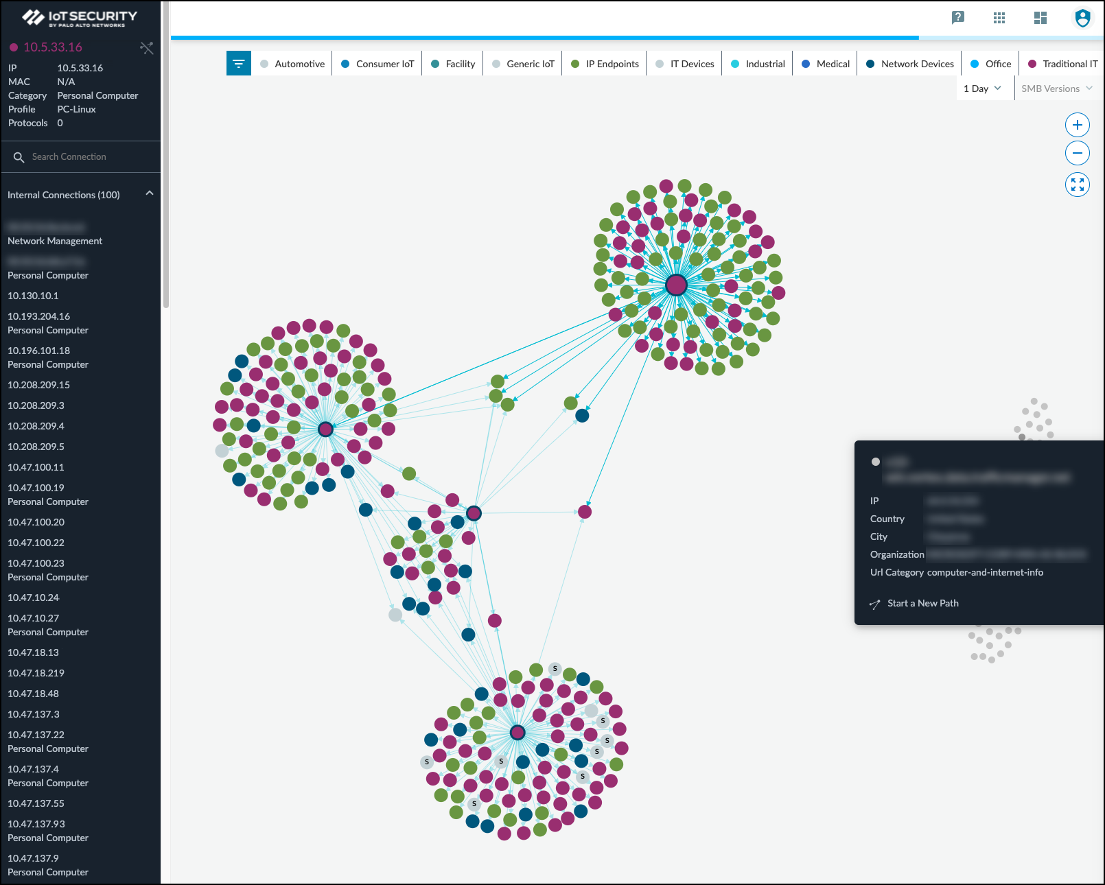 If you click Explore Topology, a new browser window opens with an informative display of internal and external connections from the device in focus. You can interact with the information, viewing details about each node and clicking different ones to put them in focus and see their connections.