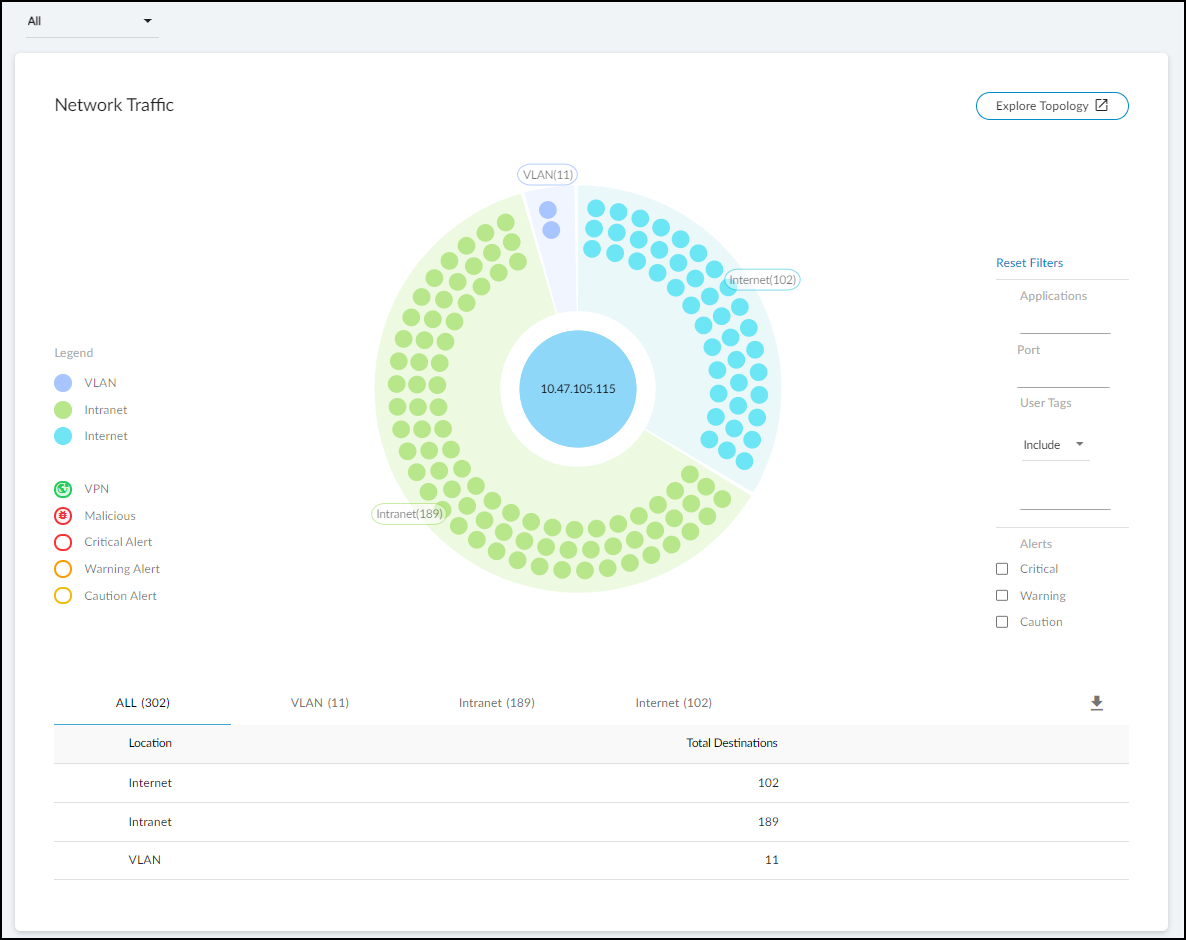 - Network Traffic: View a conceptual network topology displaying the nodes with which the device has formed connections. Use filters to display inbound or outbound connections; nodes with various alert levels; connections to nodes within the same VLAN, same intranet, or in the Internet; and so on.