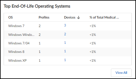 • Top End-of-Life Operating Systems: These are devices running an OS version that the vendor no longer supports with patch updates, making them more vulnerable to attack. The table shows how many device profiles have devices with an end-of-life OS and the percent of affected medical devices relative to all medical devices. Clicking a number in the Devices column opens the Assets Inventory page filtered to show only devices running this operating system and version.