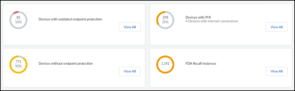 • Devices with various risk factors are listed. For each one the total number of devices with this risk and their percent relative to all medical IoT devices are shown. Clicking View All for the first three opens the Assets Inventory page with a filter to show just these devices. Clicking View All for Devices with FDA recalls opens the VulnerabilitiesRecalls page.
