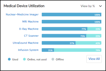 • Medical Device Utilization: This panel shows all medical IoT categories and how the devices in each one are being utilized. A bar chart shows the percentages of time the devices in a category are detected in use, online but not in active use, and offline. Hover your cursor over a bar to see a pop-up with numbers for each kind of utilization. Click a medical device category to open the Assets Inventory page in a new browser tab or window. The page is filtered to show devices in the selected category.