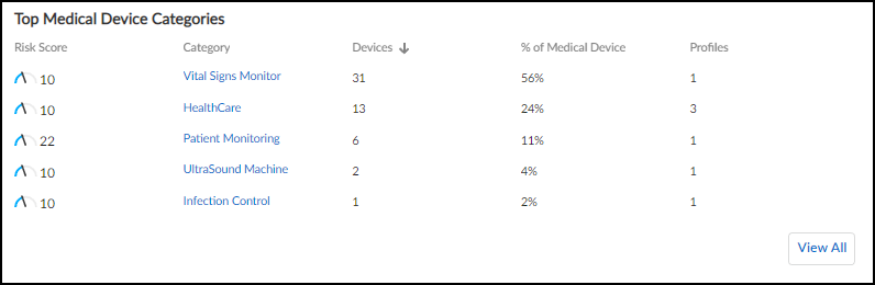 • Top Medical Device Categories: This panel lists the medical device categories and ranks them by device count, with those that contain the largest number of medical devices at the top. Clicking a category name opens a new browser window displaying the Assets Inventory page filtered to show just entries matching this category. Clicking View All in the lower right opens the Assets Inventory page filtered to show all medical devices.