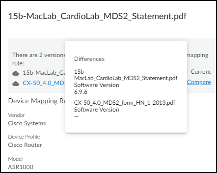 The information panel for a file you uploaded includes an Edit option, but the panel for a community-shared file does not. - To compare two duplicate files, either click or hover your cursor over Compare. Device Security compares it with the currently applied file. In the example shown here, you can see that the first MDS2 file is prioritized because it has a software version whereas the second file does not.