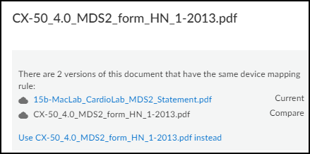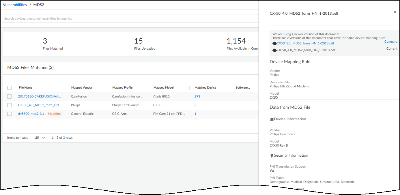 If there are duplicate MDS2 files and you want to use something different from what Device Security automatically selected, manually override the selection.When more than one MDS2 file applies to the same vendor, profile, and model, you might want Device Security to apply a different MDS2 file other than the one it automatically selected. For example, you might choose an earlier format version if your medical IoT devices are running earlier software versions and this MDS2 file applies to them more accurately than a later one would.- Click an MDS2 file name on the VulnerabilitiesMDS2 page.The information panel that opens on the right side of the page lists duplicate MDS2 files in order of priority.