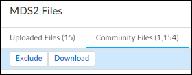 - On the RisksMDS2 page, click <number> Files Available in Community.The RisksMDS2All MDS2 page opens with two tabs: one for the files you uploaded (Uploaded Files) and one for files shared in the community (Community Files).