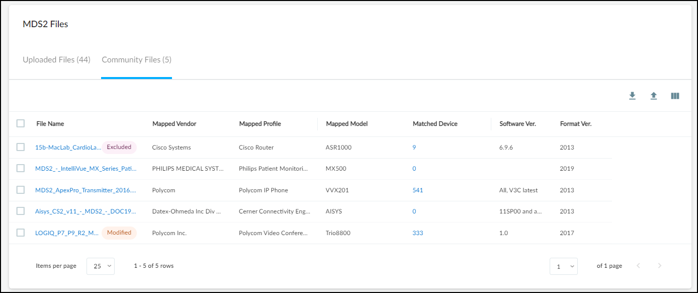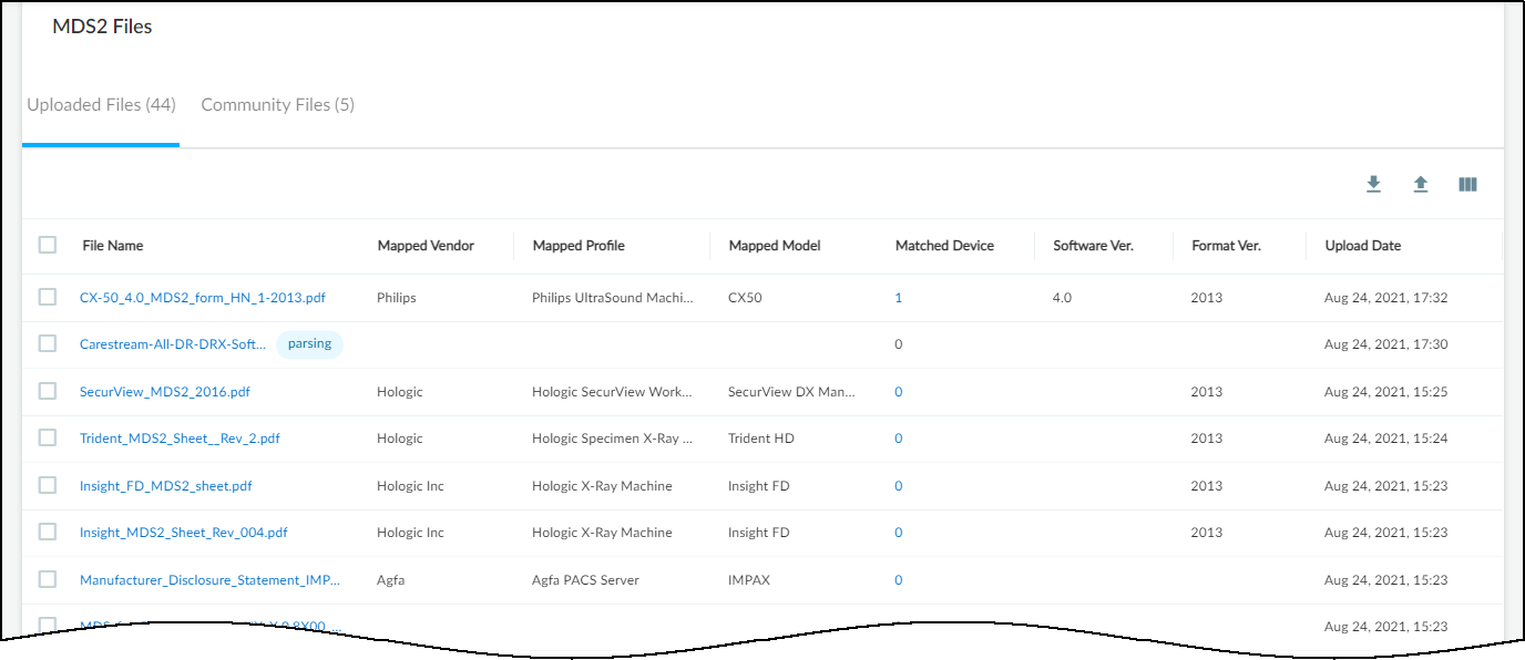 - On the VulnerabilitiesMDS2 page, click <number> Files Available in Community.The VulnerabilitiesMDS2MDS2 Files page opens with two tabs: one for the files you uploaded (Uploaded Files) and one for files shared in the community (Community Files).
