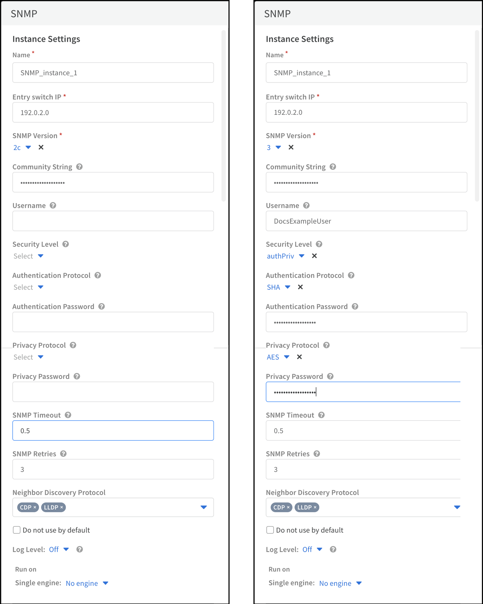 - Enter the following settings and leave the other settings at their default values:Name: Use the default name of the instance, or enter a new one.Entry switch IP: Enter the IP address of the entry switch with which to begin the SNMP discovery process.SNMP Version: Choose the SNMP version that your switches support, either 2c (SNMPv2c) or 3 (SNMPv3). If you choose 2c, configure the Community String and Use a single engine settings. If you choose 3, configure the Username, Security Level, Authentication Protocol and Password, and Privacy Protocol and Password settings.Community String (for SNMPv2c): Enter the SNMP community string configured on the switches to permit read-only access.Username (for SNMPv3): Enter a username for an SNMP user account with read-only access. This is the account XSOAR uses when accessing an SNMP server running on a switch. The security level and authentication password defined below are also associated with this user account.Security Level (for SNMPv3): Choose the security level for accessing an SNMP server on a switch.