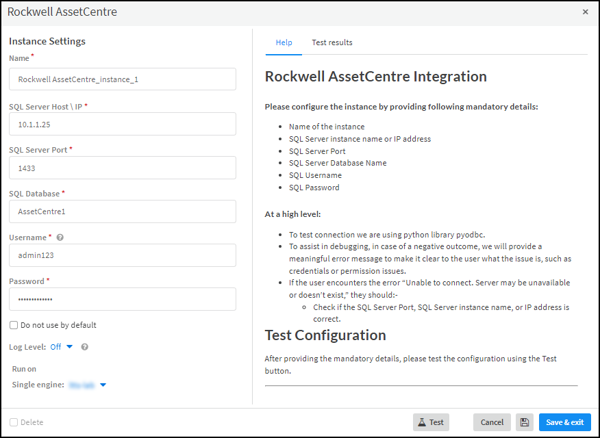 - Enter the following and leave the other settings at their default values:Name: Either use the default name (Rockwell AssetCentre_instance_1) or enter a new one.Remember the instance name because you are going to use it again when creating a job that Cortex XSOAR will run to gather data from the SQL database specified in this integration instance.SQL Server Host/IP: Enter the domain name or IP address of the Microsoft SQL server.SQL Server Port: Enter the default TCP port number 1433 or, if a different port number is set on the SQL server, enter that.SQL Database: Enter the name of the database from which you want XSOAR to retrieve device information.Each integration instance can retrieve device information from a single database. If you want to retrieve device information from other databases, you must create additional integration instances for them.Username: Enter the name of the user account you previously configured for XSOAR to access the Microsoft SQL server.Password: Enter the password associated with the user account.Run on Single engine: Choose the XSOAR engine that you want to communicate with the Microsoft SQL server.