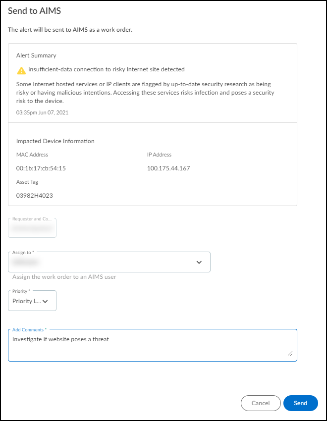 orTo create a work order for a vulnerability, click VulnerabilitiesVulnerability OverviewAll Vulnerabilities, click the name of the vulnerability you noted earlier, select the device name in the Instances column, and then click MoreSend toAIMS.The Send to AIMS dialog box appears. - Choose someone to assign the work order to in the Assign to list, choose a severity level in the Priority list, and enter a note in the Add Comments field.