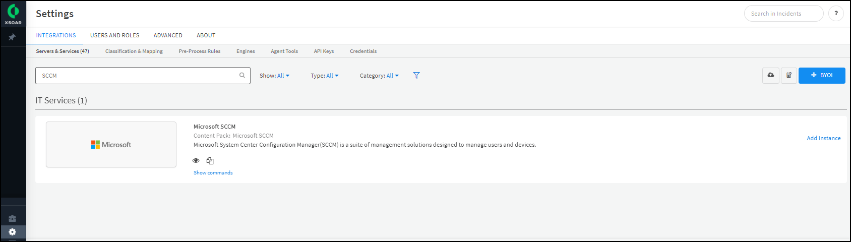 Device Security uses Cortex XSOAR to integrate with Microsoft SCCM, and the settings you must configure to integrate with it are in the XSOAR interface. - To access these settings, Launch Cortex XSOAR.The Cortex XSOAR interface opens in a new browser window.