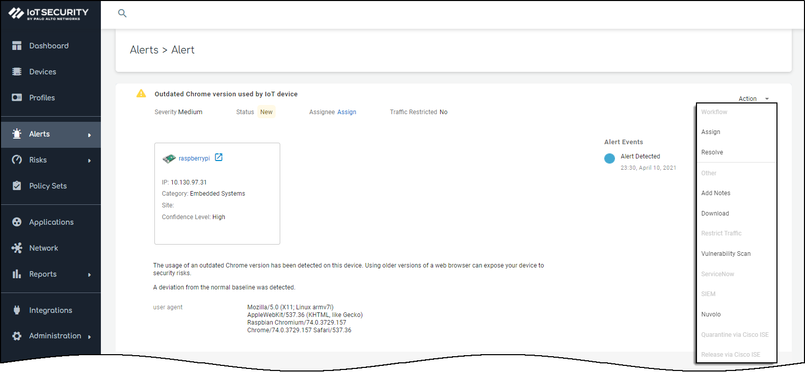 OrClick AlertsSecurity AlertsAll Alerts, click the name of a Security alert, click ActionNuvolo.