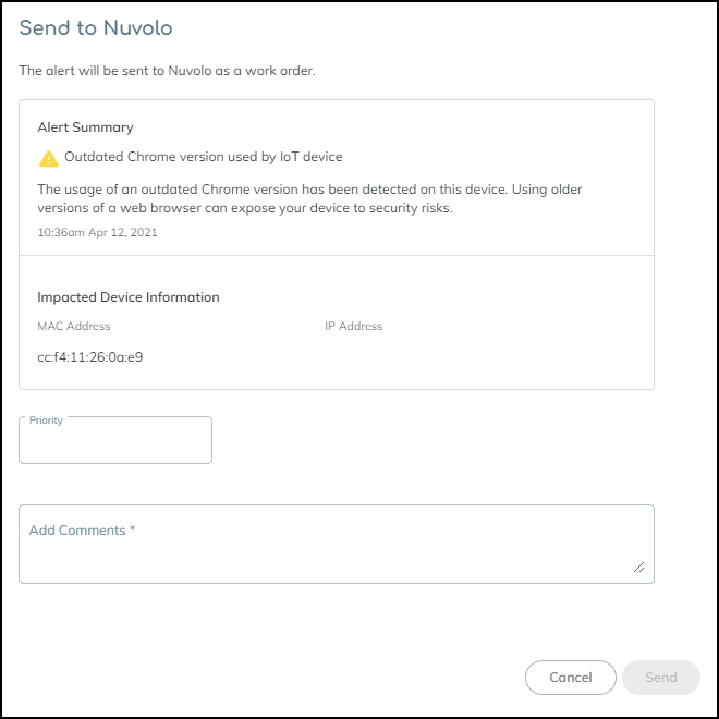- Enter a priority number using the priority numbering system in Nuvolo and add a comment.After you’ve configured these three required settings, the Send button changes from gray to blue, indicating that you can proceed.