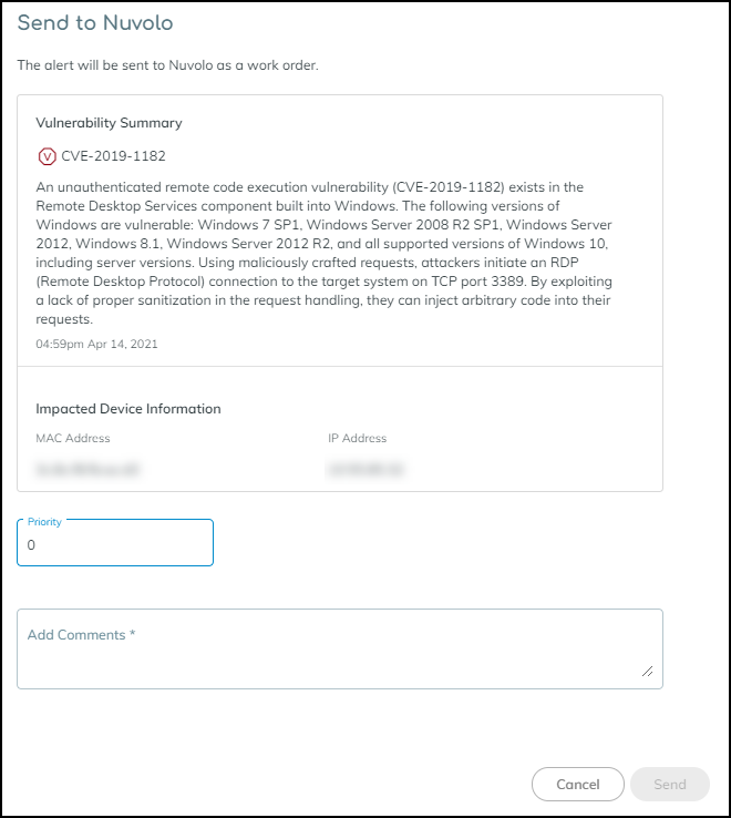 - Navigate to RisksVulnerabilities, click a vulnerability name, and then select the check box of a vulnerability instance.Click MoreSend toNuvolo.The Send to Nuvolo panel appears.Enter a priority number using the priority numbering system in Nuvolo and add a comment.After you’ve configured these required settings, the Send button changes from gray to blue, indicating that you can proceed.