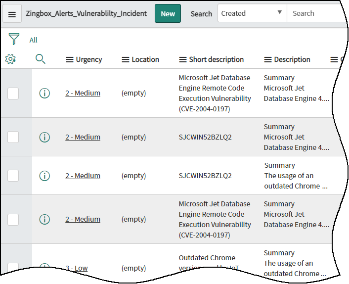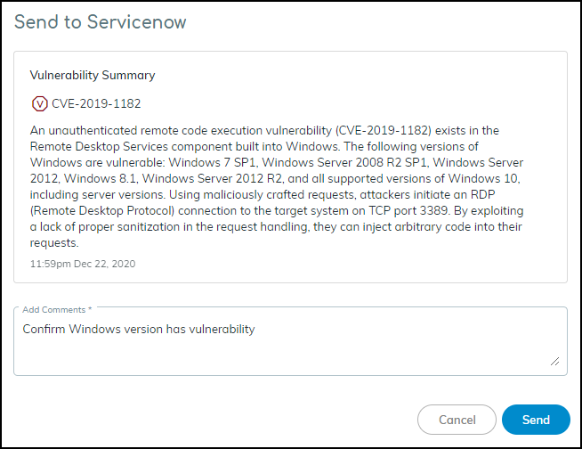 - Click VulnerabilitiesVulnerability OverviewAll Vulnerabilities, click a vulnerability name, and then select the check box of a vulnerable device or potentially vulnerable device that you want to investigate.Click MoreSend toServiceNow.The Send to ServiceNow panel appears.