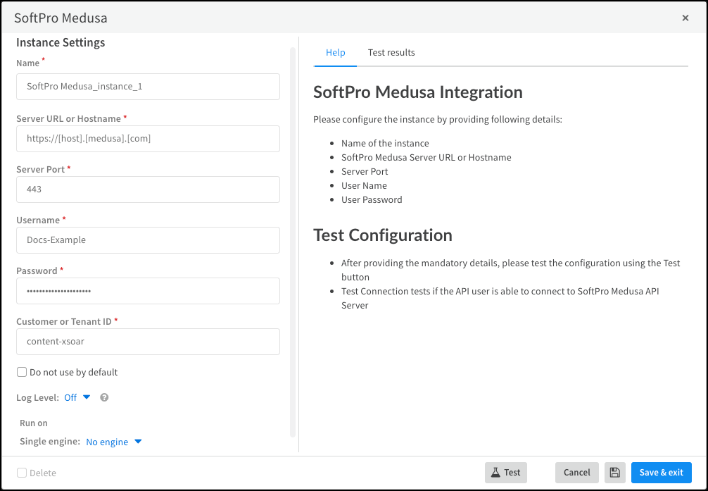 • Use single engine: When using a cloud-based Cortex XSOAR instance and an on-premises SoftPro Medusa server, choose the Cortex XSOAR engine that you want to communicate with the SoftPro Medusa server.